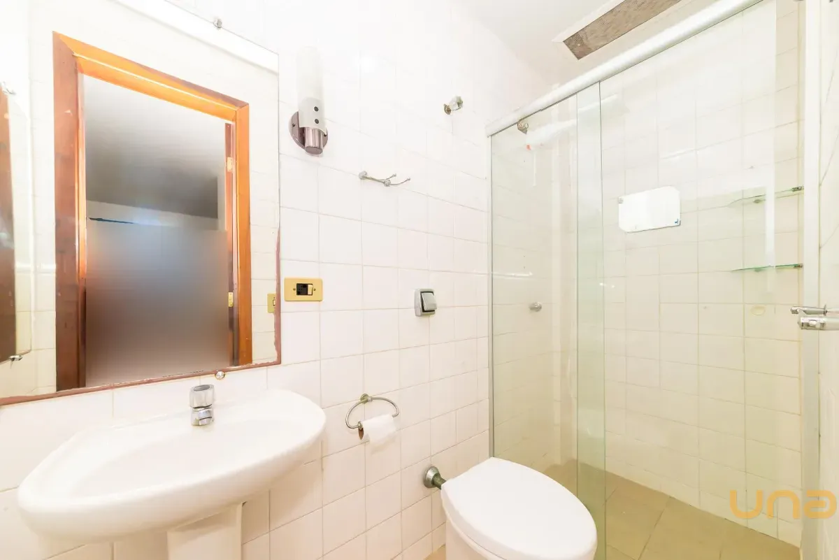 Banheiro social com box de vidro;