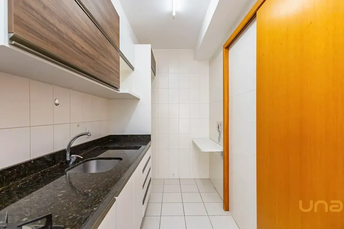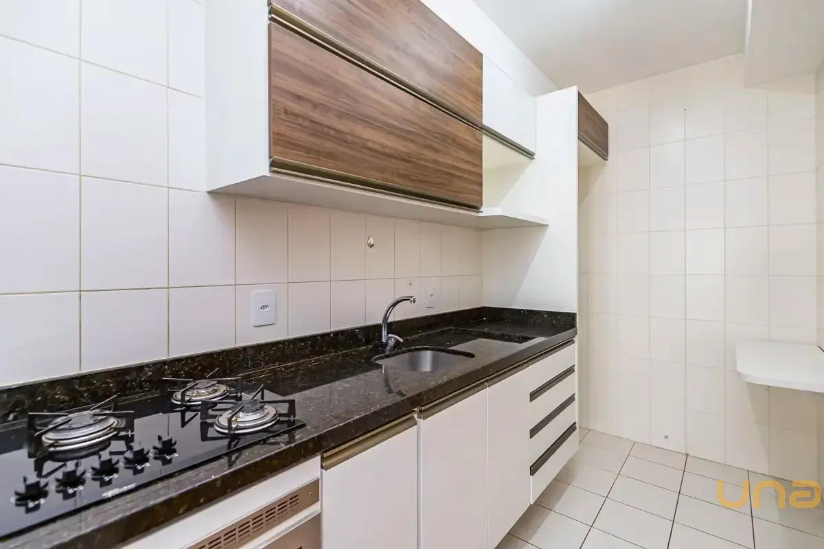 Cozinha com armários planejados, forno e cooktop.