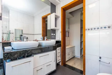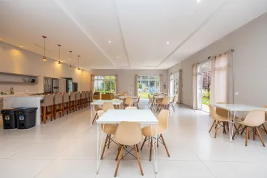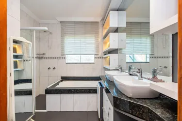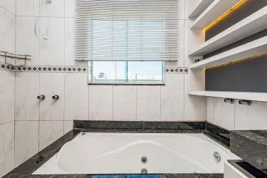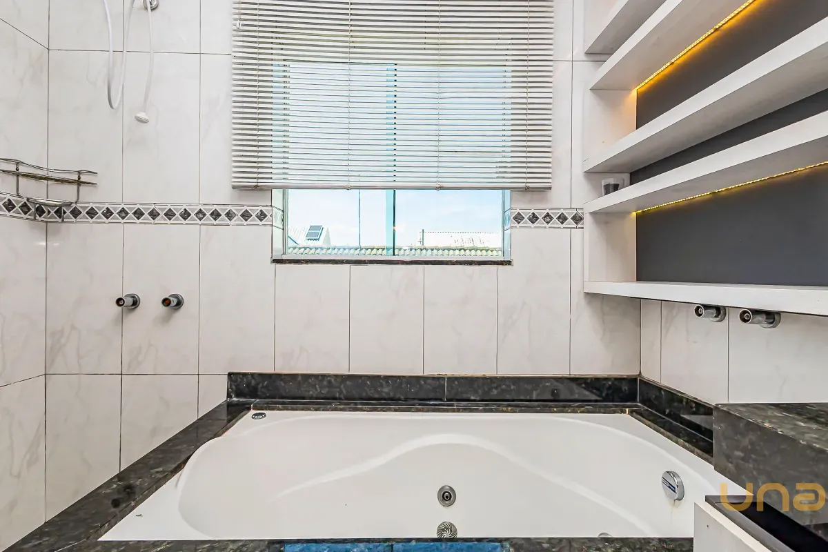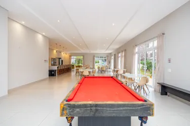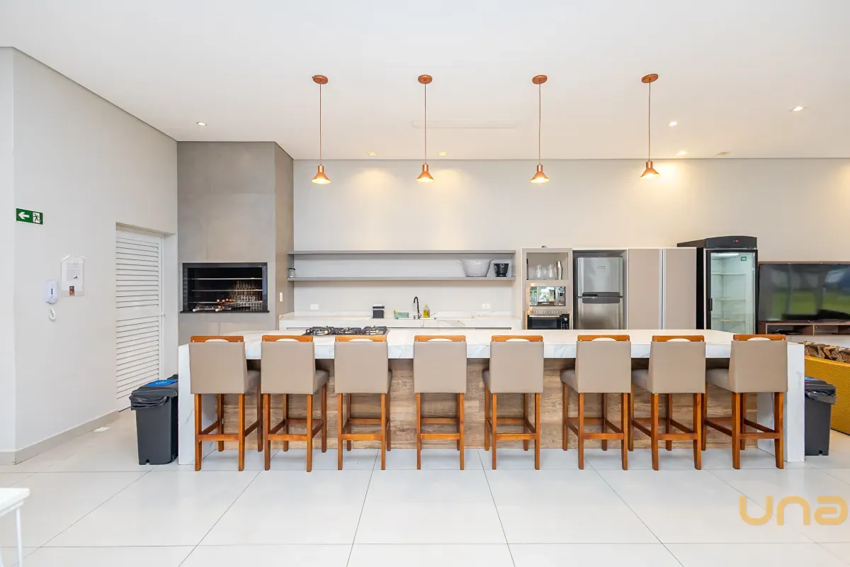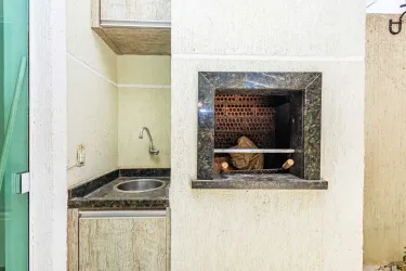 A cozinha americana, integrada à área de serviço equipada com armários planejados, é um convite à funcionalidade e organização. O espaço externo foi cuidadosamente planejado para o lazer, com uma churrasqueira para confraternizações ao ar livre, além de um teto retrátil de vidro controlado remotamente, proporcionando flexibilidade para aproveitar os momentos ao ar livre em qualquer clima.