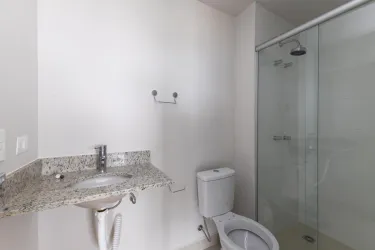Banheiro social completo equipado com box, chuveiro, pia e vaso sanitário