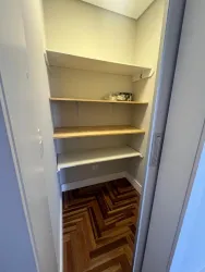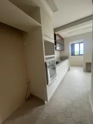 Área de serviço com armário, tanque, espaço para máquina frontal e varal de teto