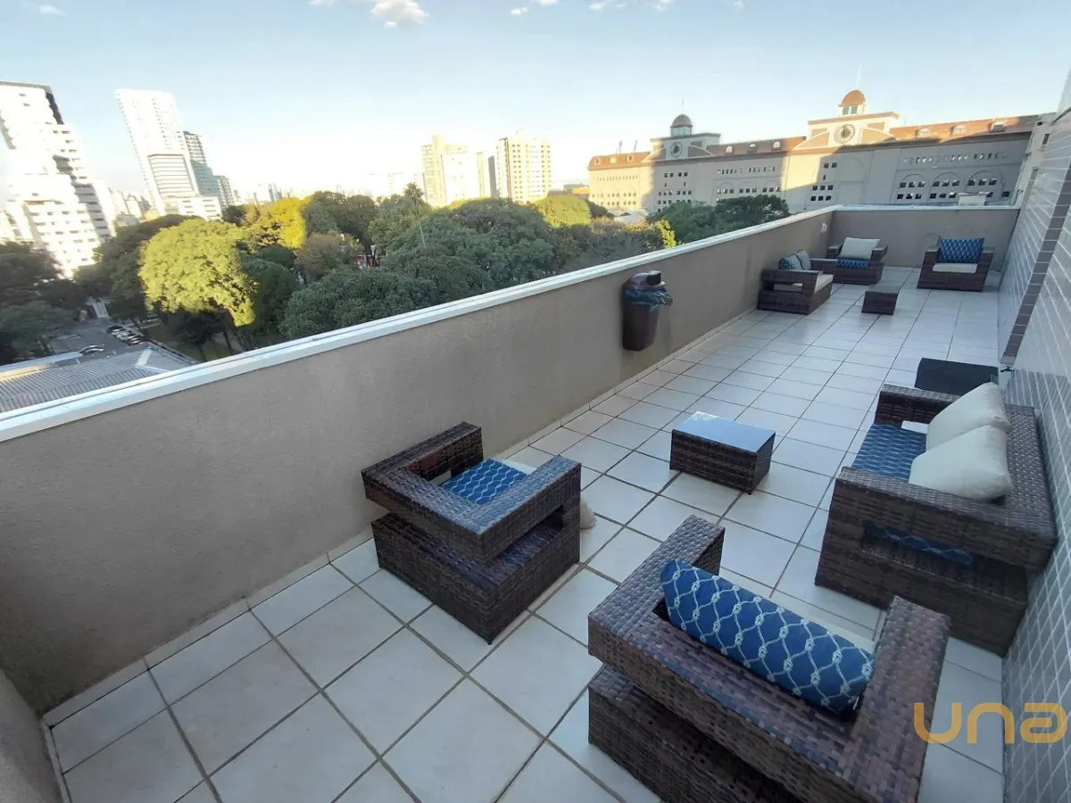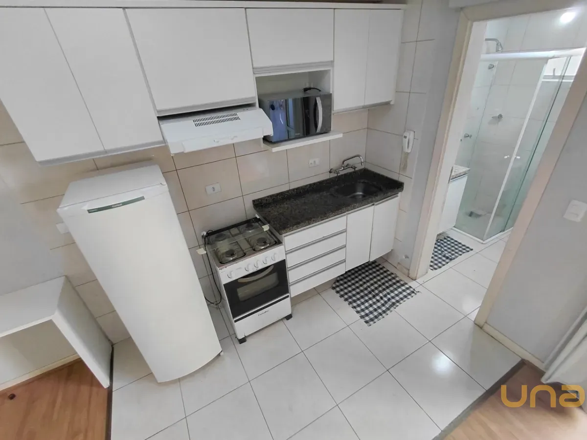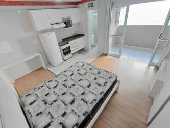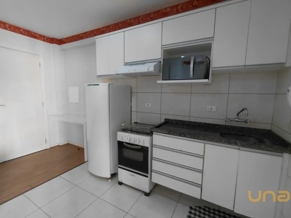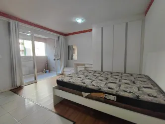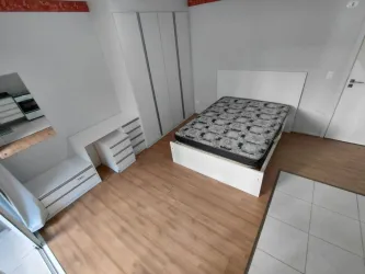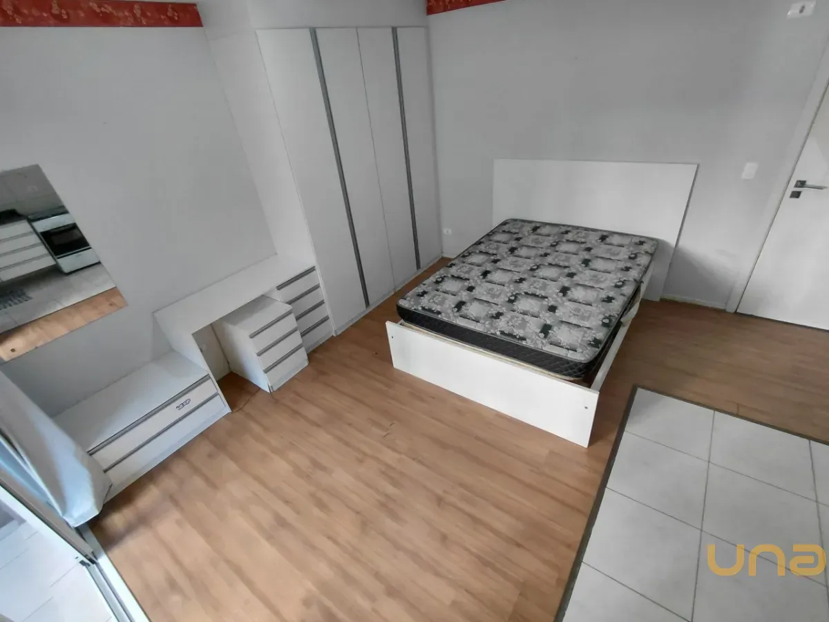Detalhes: STUDIO MOBILIADO COM CAMA DE CASAL, ARMARIO EMBUTIDO, ESCRIVANINHA / BLACKOUT / COZINHA COM ARMARIOS, MICROONDAS, GELADEIRA, FOGAO COM