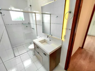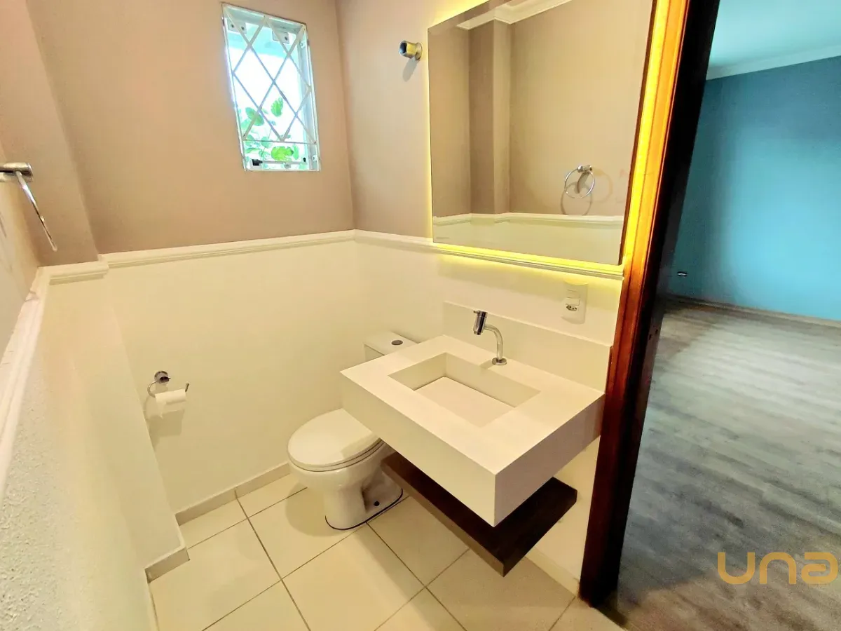 BANHEIRO SOCIAL COM BOX VIDRO, LAVATÓRIO COM BALCÃO, ESPELHO E ILUMINAÇÃO EMBUTIDA,
