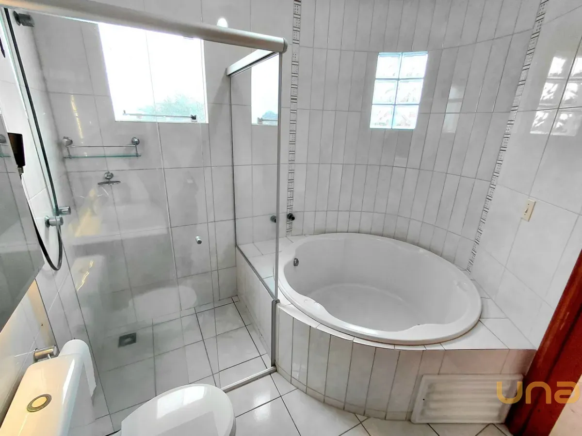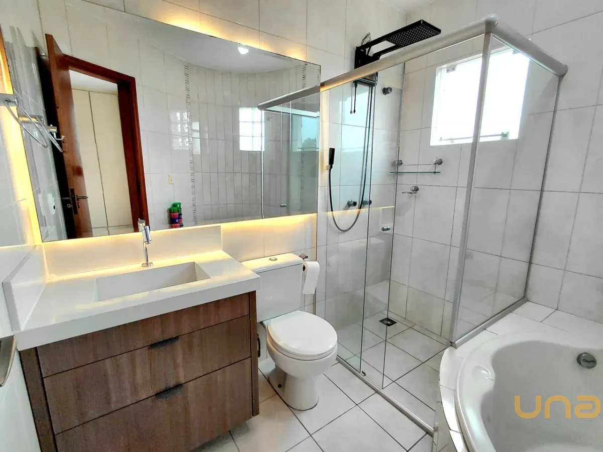 BANHEIRO PRIVATIVO COM HIDROMASSAGEM, BOX VIDRO, BALCÃO COM ESPELHO E ILUMINAÇÃO EMBUTIDA