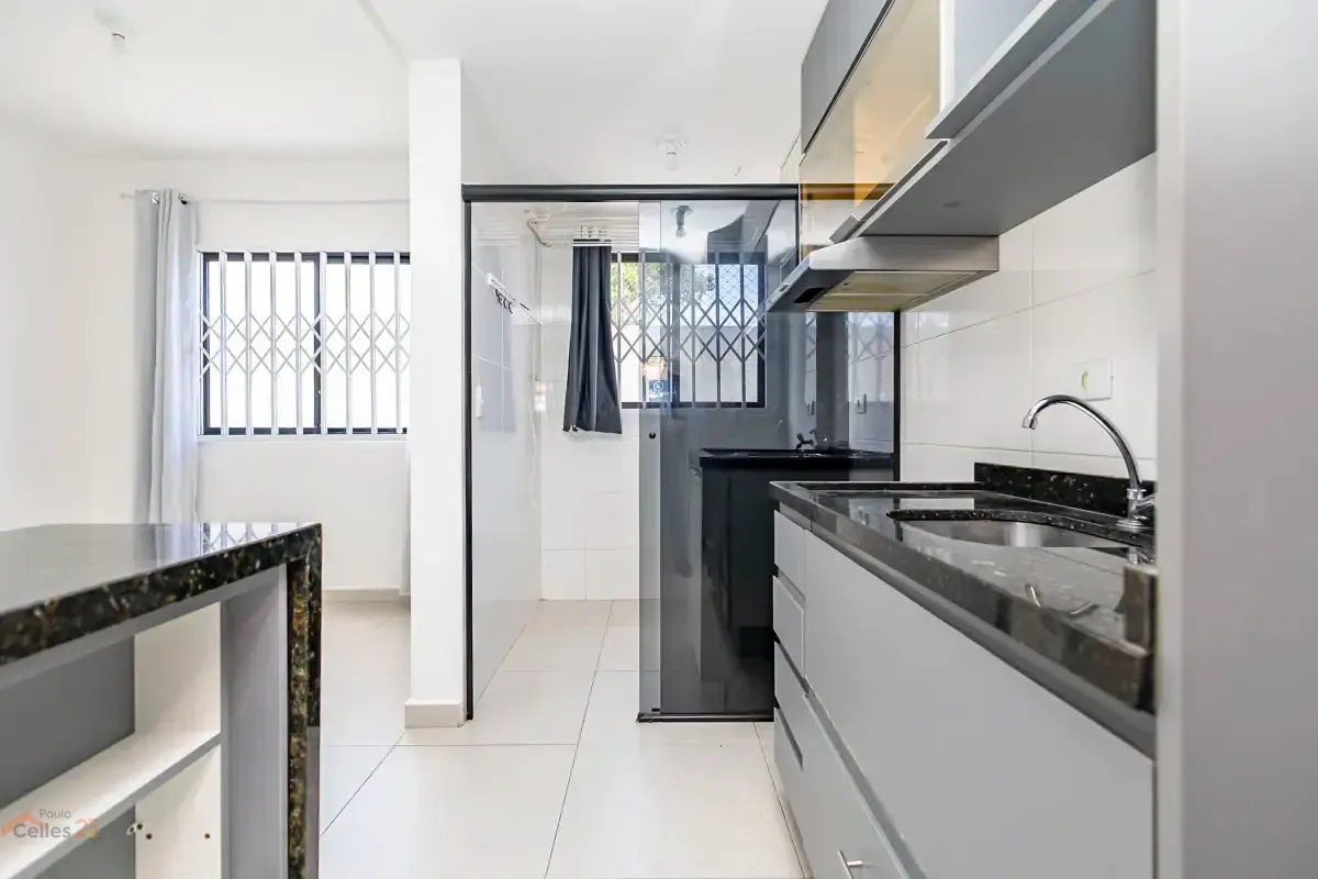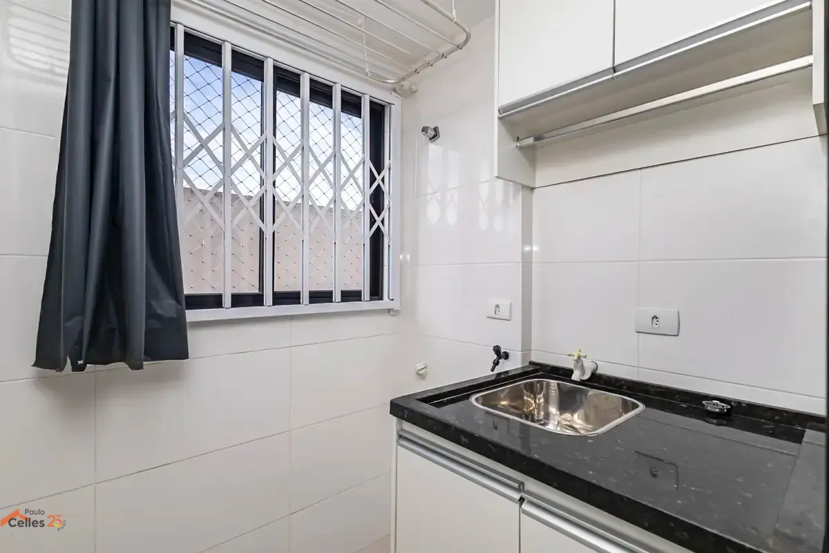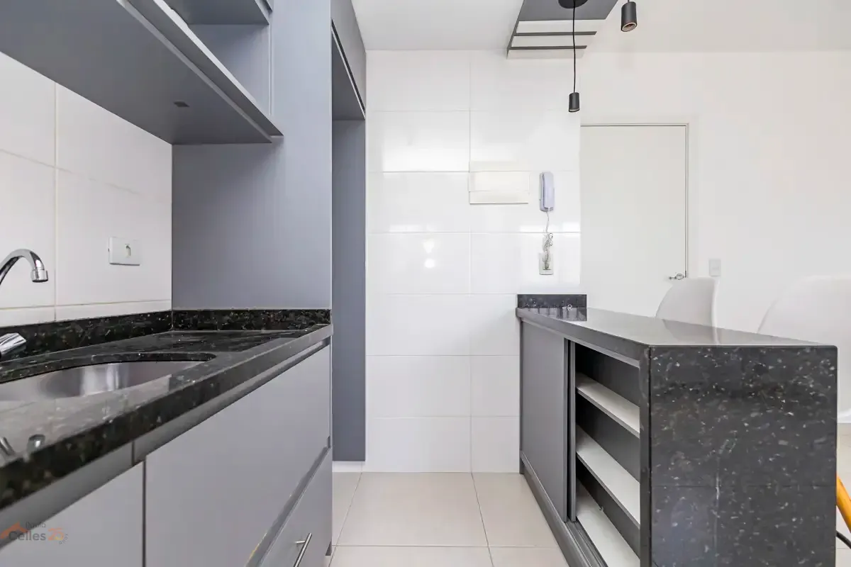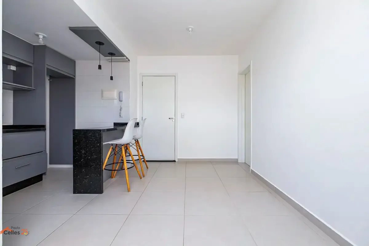 O imóvel conta com 1 quarto amplo, sala para dois ambientes com ótima integração, cozinha semiaberta equipada com armários e bancada, além de lavanderia separada também com armários. O banheiro possui ventilação natural (janela), garantindo mais conforto, e o apartamento dispõe ainda de 1 vaga de garagem marcada.