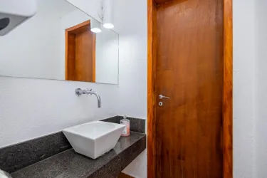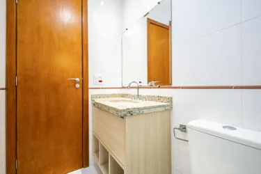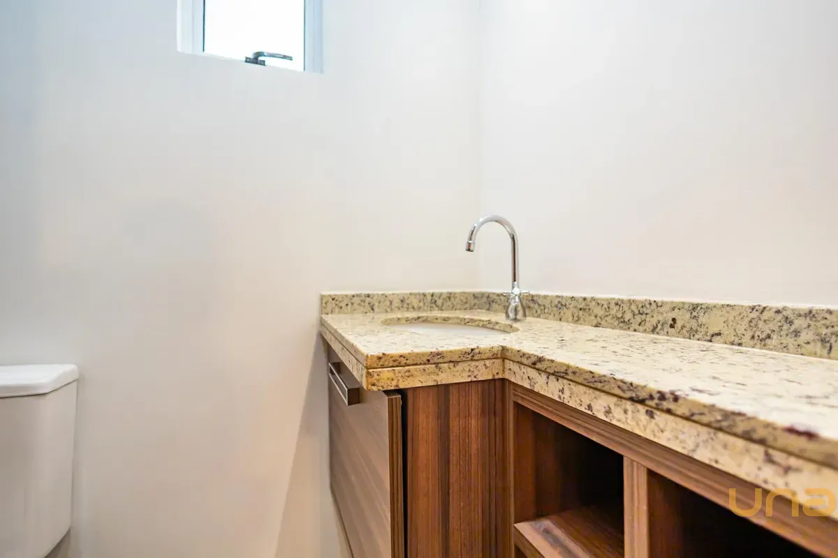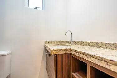 * 1 banheiro social com armário, bancada em granito e box com vidro;