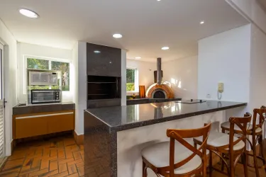 * Cozinha com armários planejados, bancada em granito, coiffa e churrasqueira integrada a cozinha;