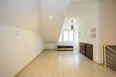 * Sala para 2 ambientes com bancada de canto em madeira, painel de tv, teto em gesso e lâmpadas dicroicas, escada em madeira;