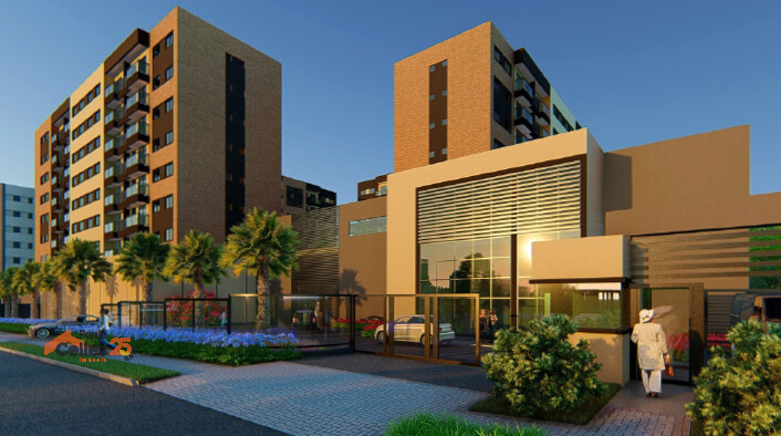 São 2 torres com 3 elevadores, 16 apartamentos por andar e 7 andares.