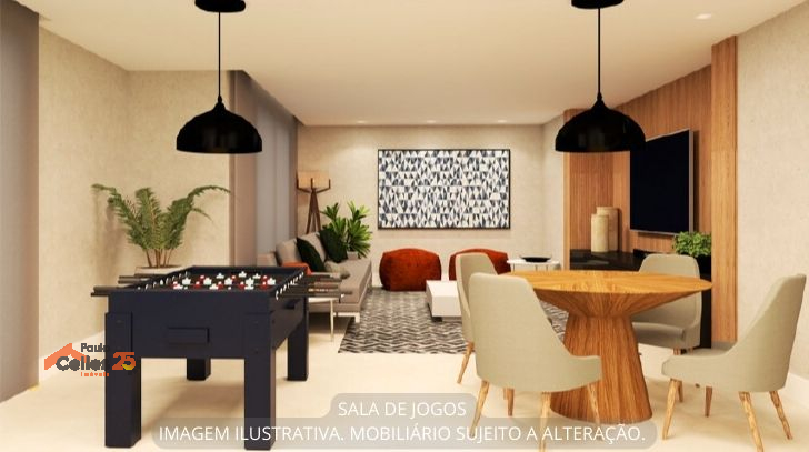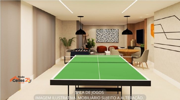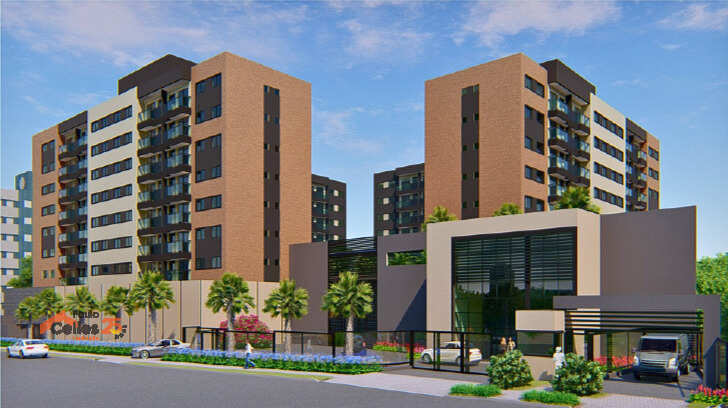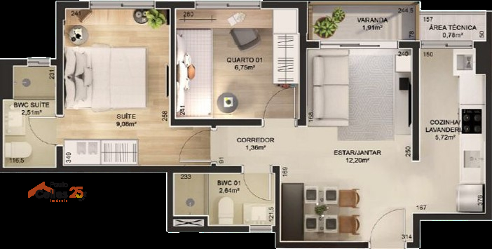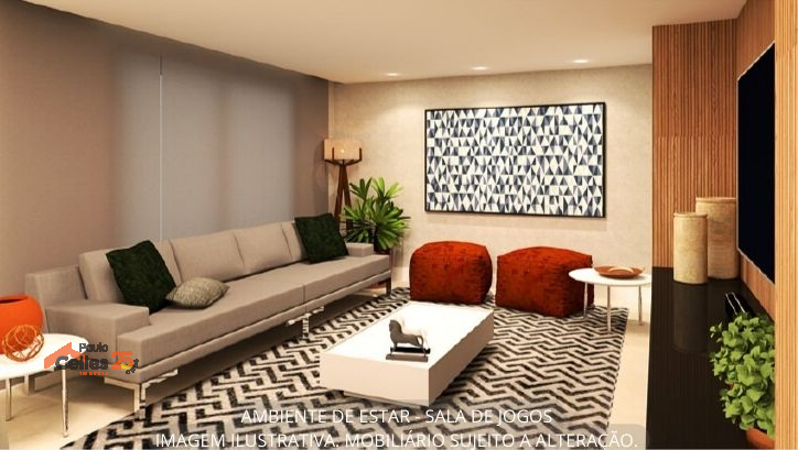 Apartamento com 2 quartos, sendo um deles suíte, sala com sacada, banheiro social, cozinha e lavanderia.