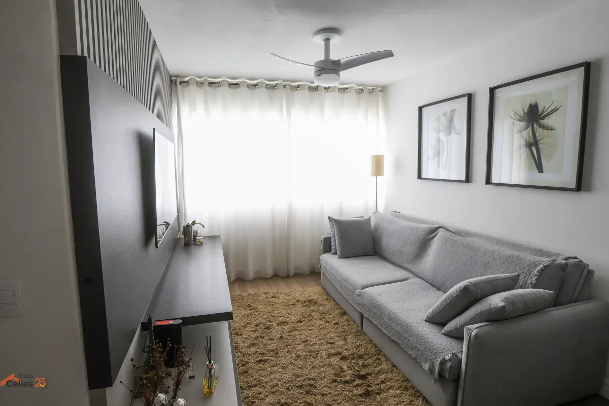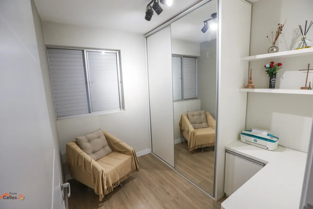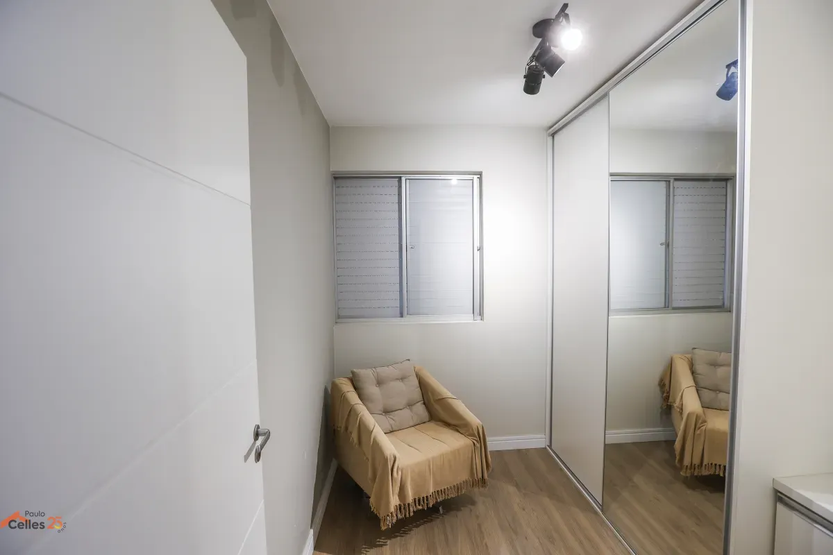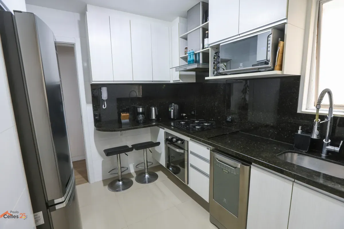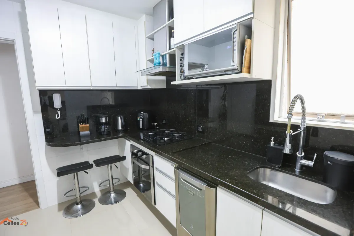 Apartamento reformado, de frente, com 3 quartos (1 suíte), armários sob medida, cozinha com fogão, forno e exaustor, lavanderia separada, cortinas e 1 vaga de garagem para carro pequeno.