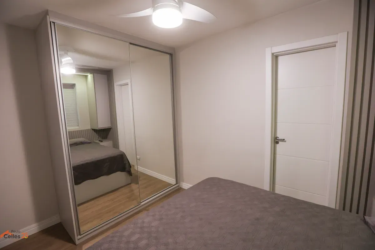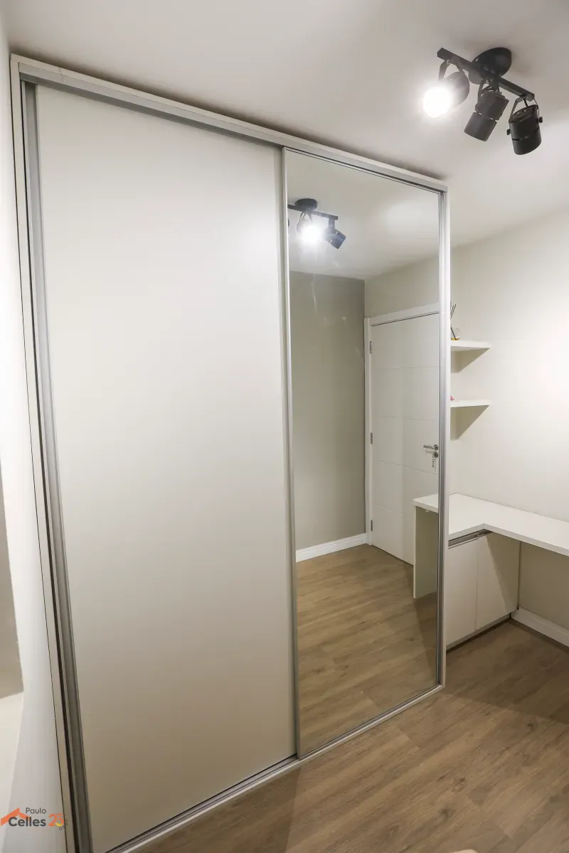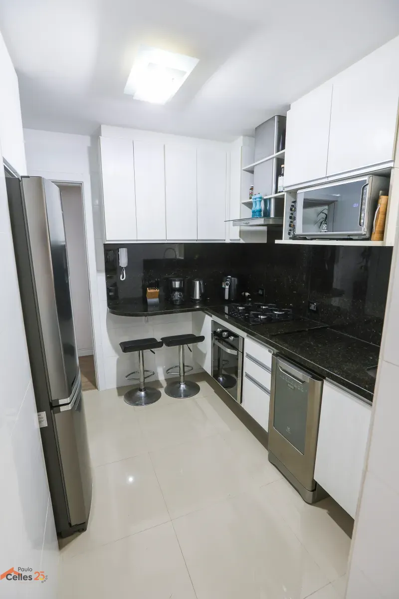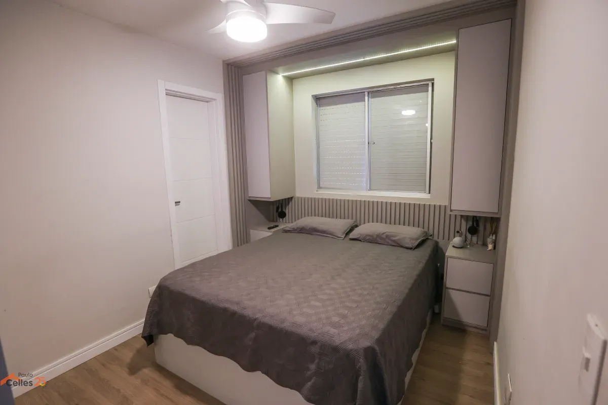 Apartamento reformado, de frente, com 3 quartos (1 suíte), armários sob medida, cozinha com fogão, forno e exaustor, lavanderia separada, cortinas e 1 vaga de garagem para carro pequeno.