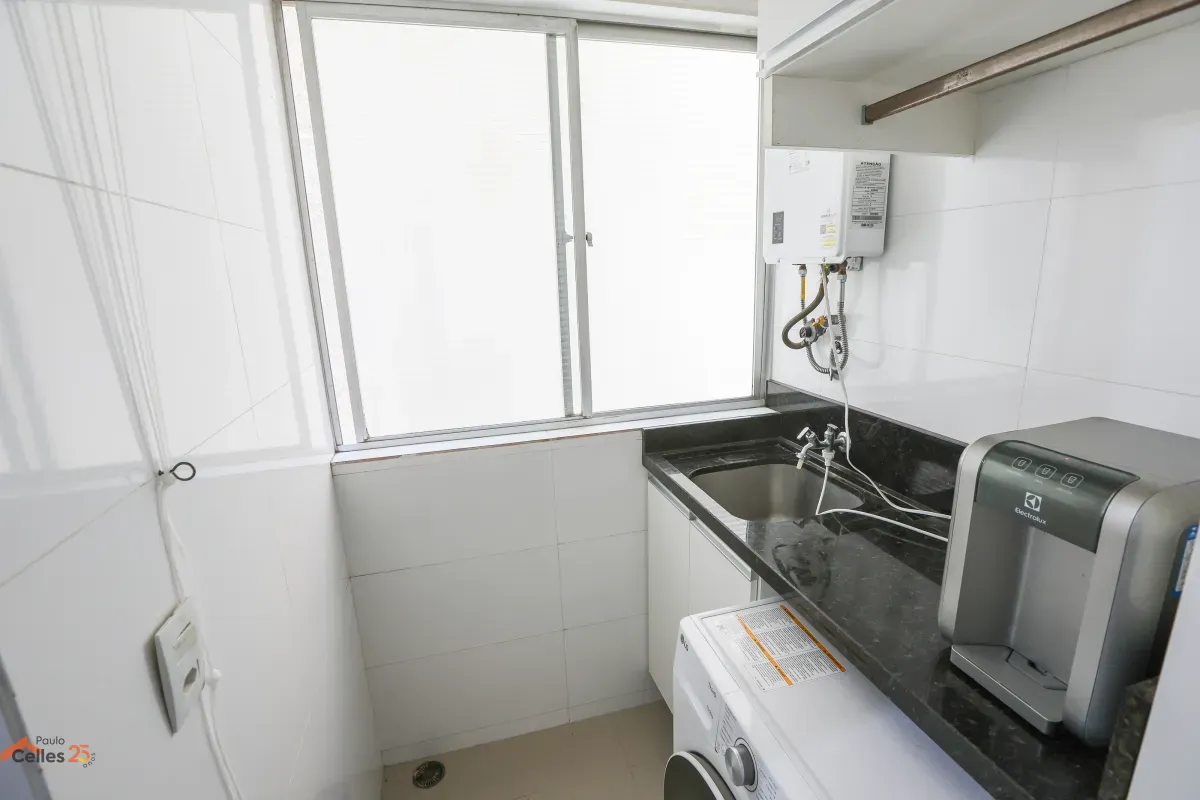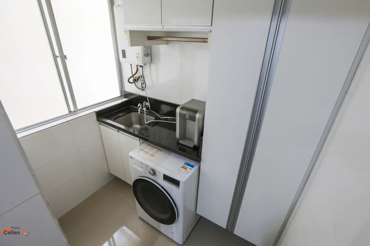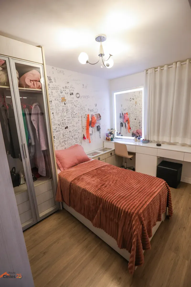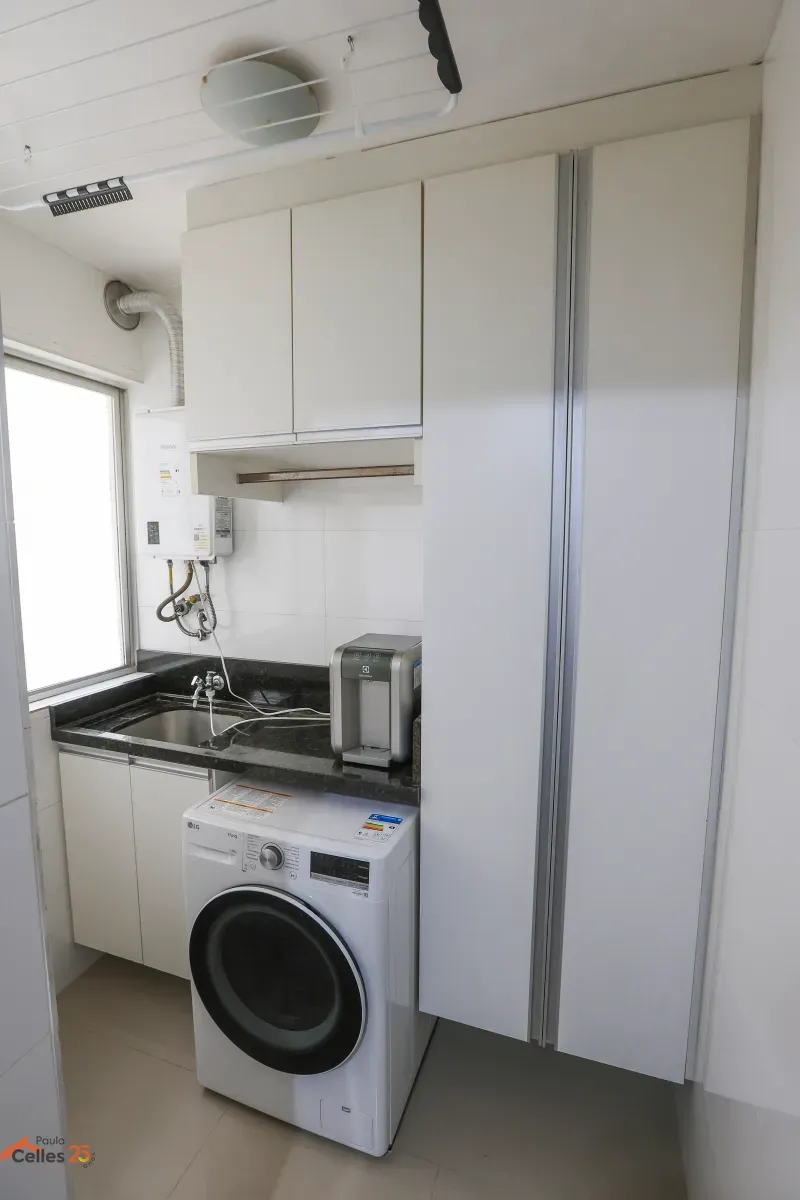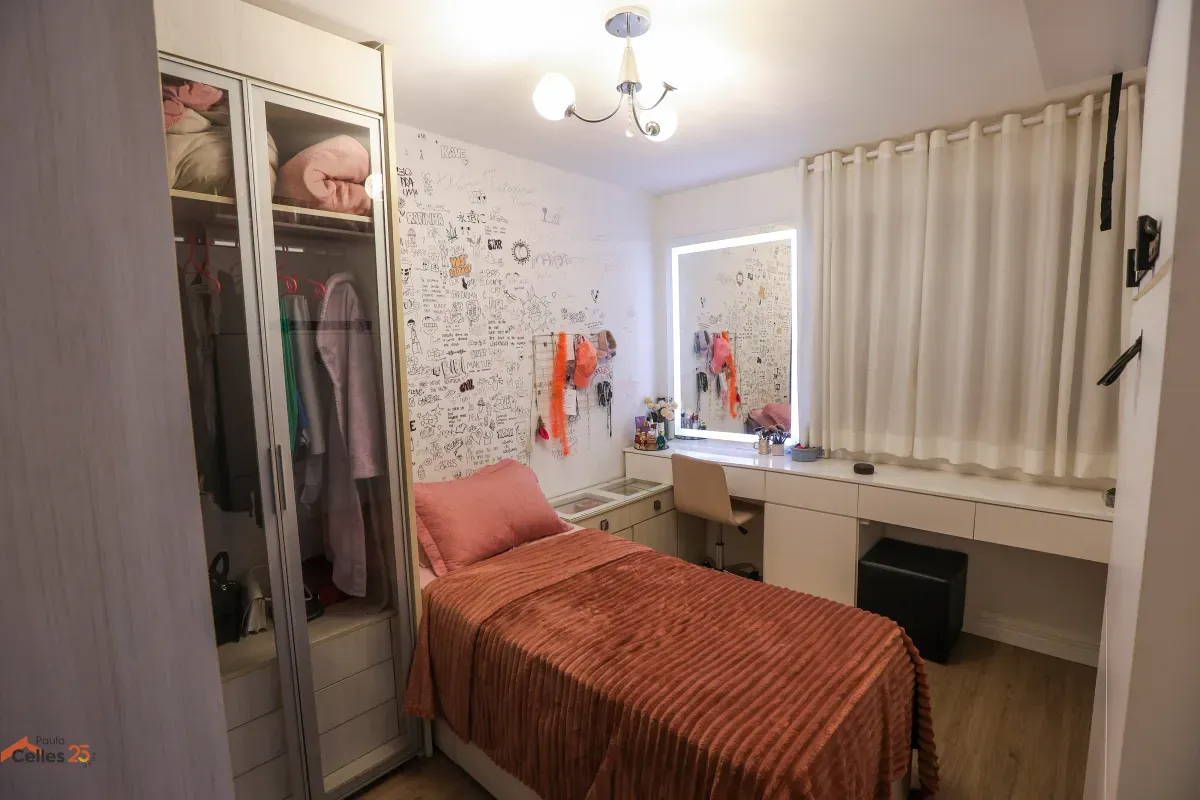 Apartamento reformado, de frente, com 3 quartos (1 suíte), armários sob medida, cozinha com fogão, forno e exaustor, lavanderia separada, cortinas e 1 vaga de garagem para carro pequeno.