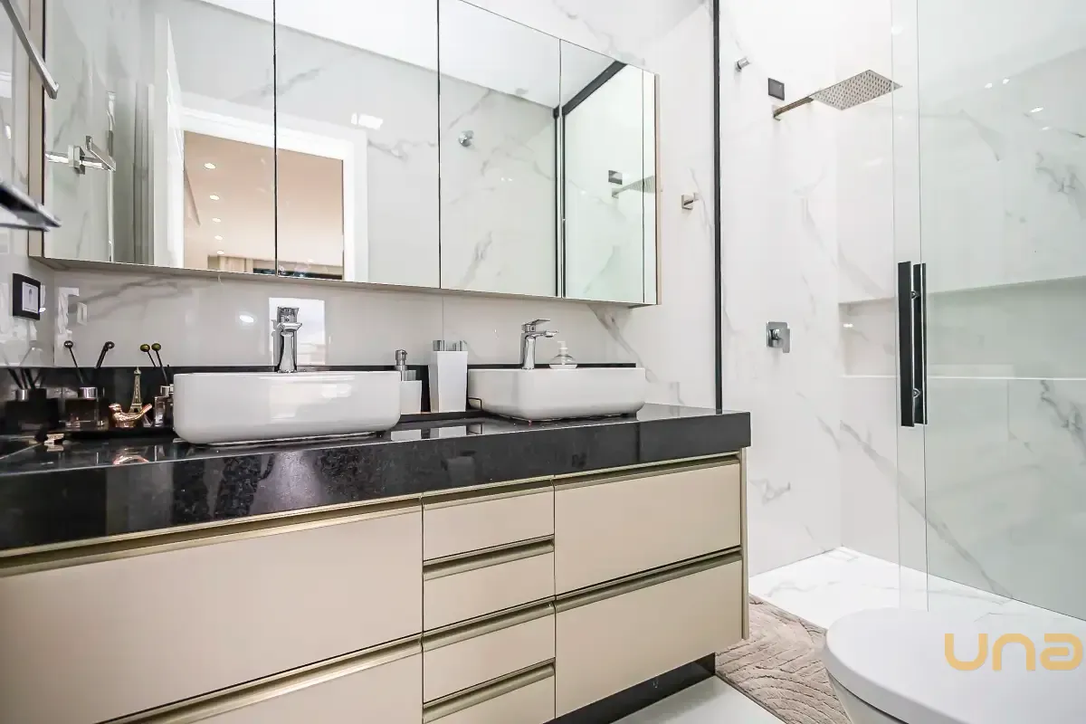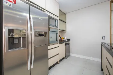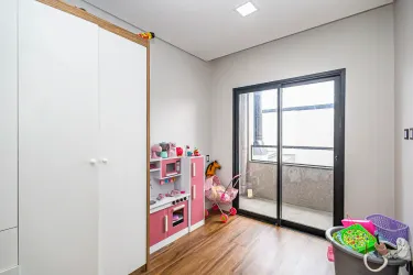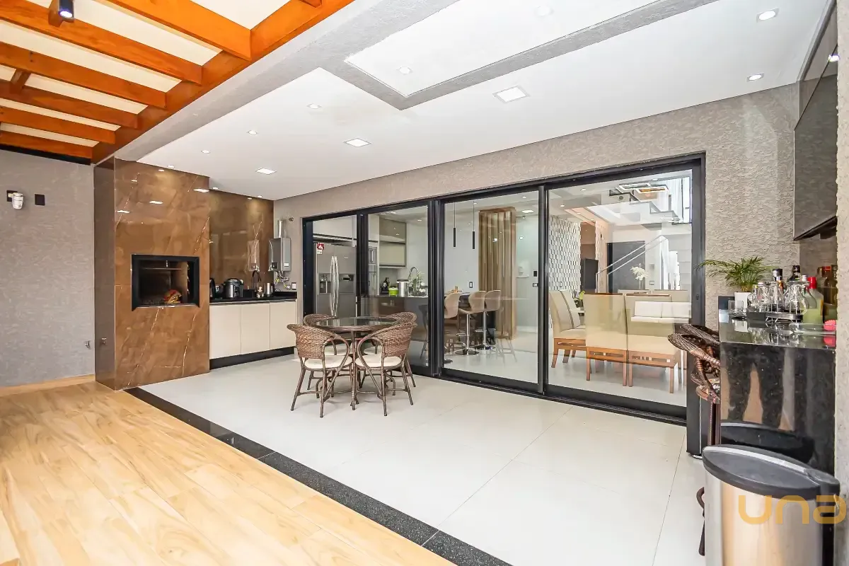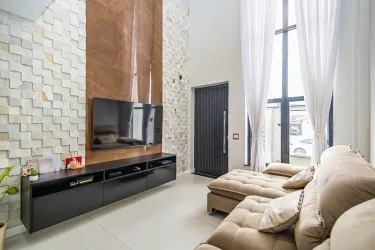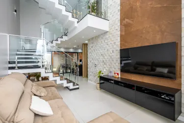 Sobrado distribuído de forma funcional, com excelente padrão de acabamento. O imóvel conta com uma ampla sala para dois ambientes, equipada com sofá confortável, painel em madeira com TV e elegante revestimento em parede 3D, que agrega sofisticação ao espaço. A integração com a cozinha, o espaço gourmet e a sala de jogos proporciona um layout moderno, ideal para convivência e recepção de convidados.