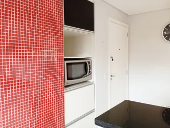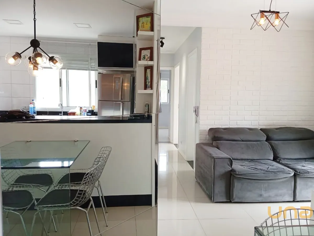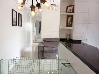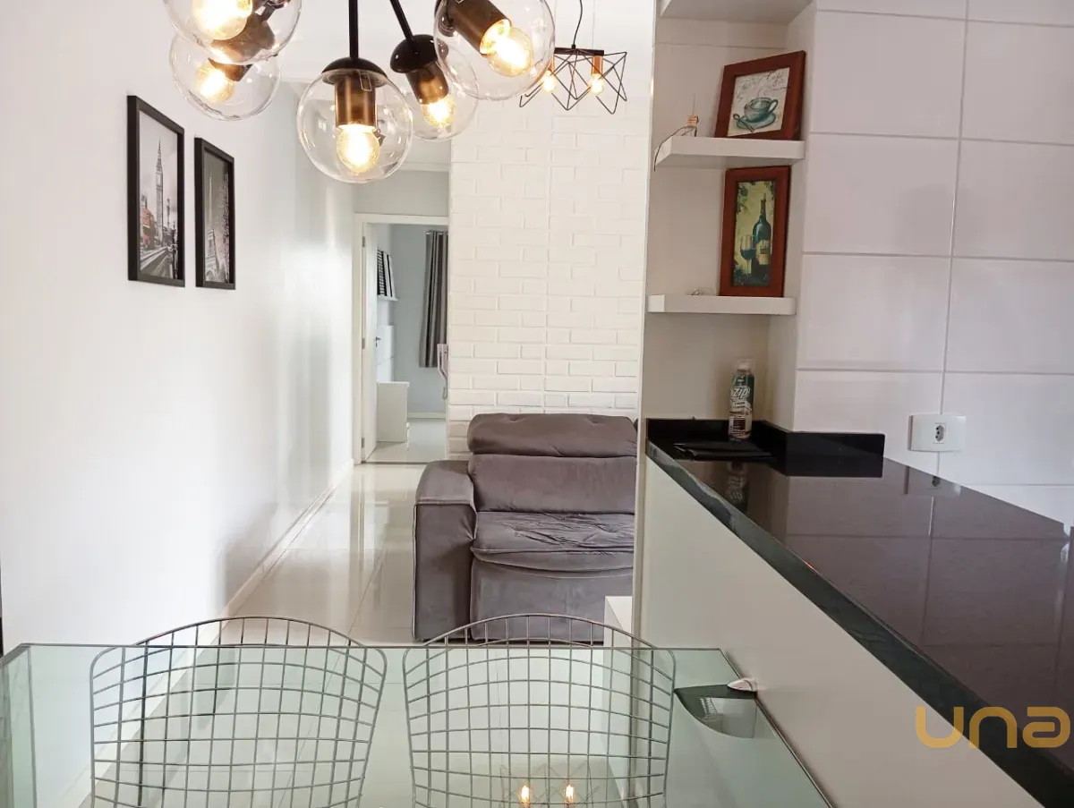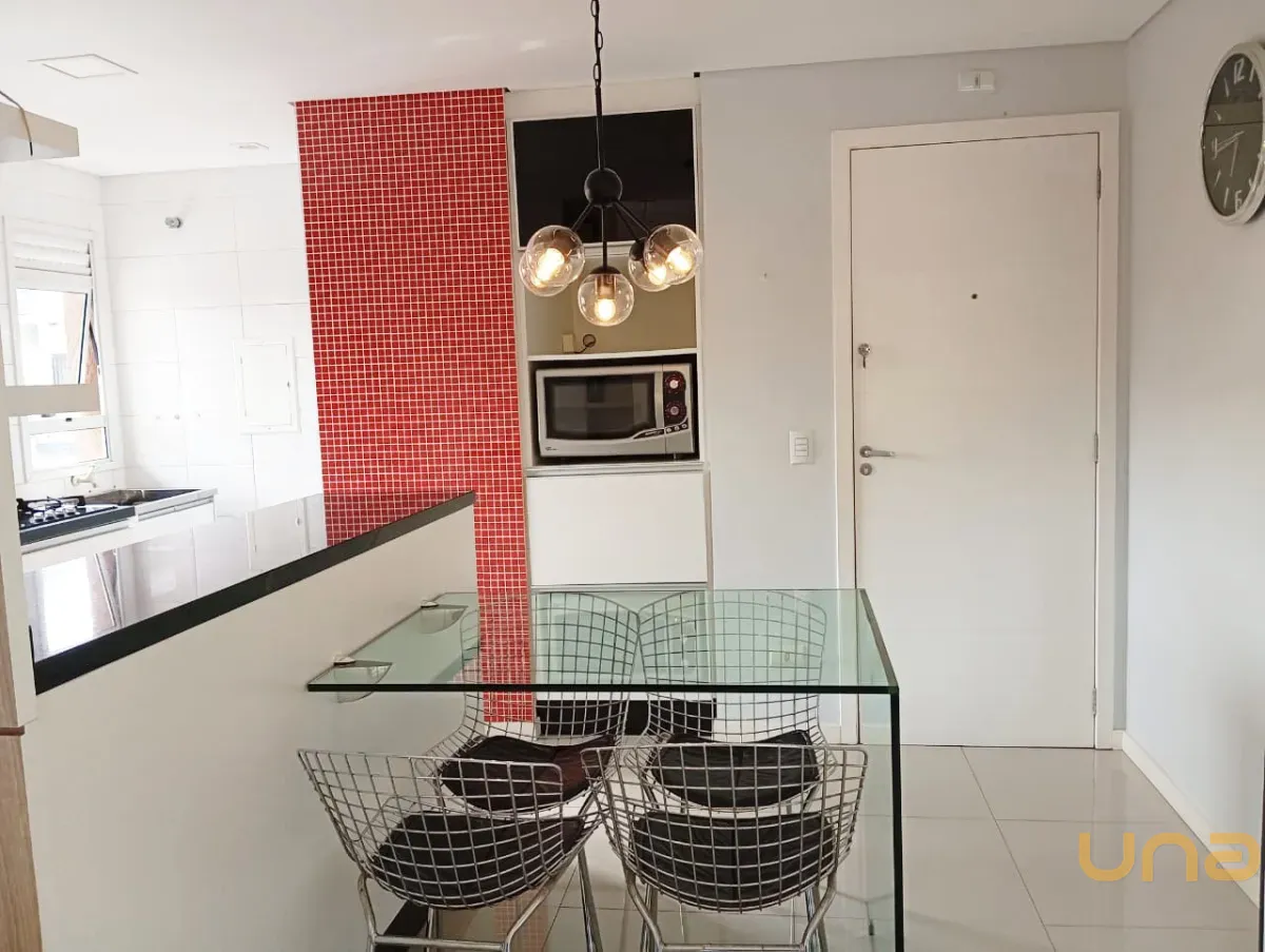 sala de estar para 02 ambientes mesa, 04 cadeiras, sofá, cozinha com armários planejados de ótima qualidade, geladeira, ampla sacada com churrasqueira, 02 dormitórios, sendo 01 com armários, banheiro social com box, parede com pastilha e 01 vaga de estacionamento descoberta para uso de carro pequeno.