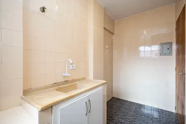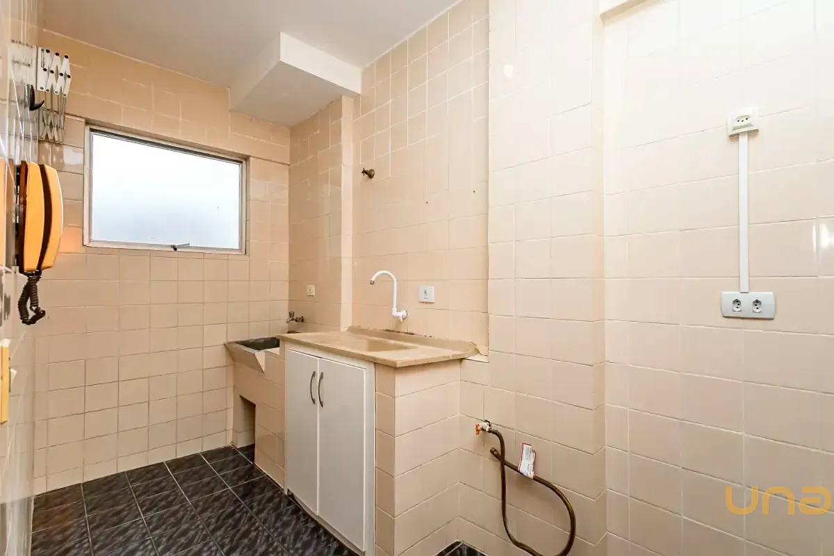 Detalhes: Apartamento com quarto amplo, sala de estar para 2 ambientes, banheiro com box e cozinha com pia, armário e área de serviço.