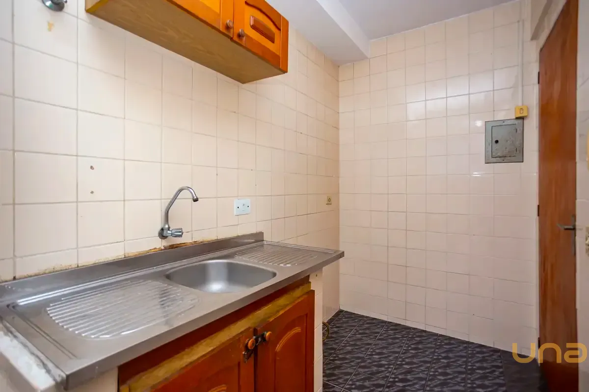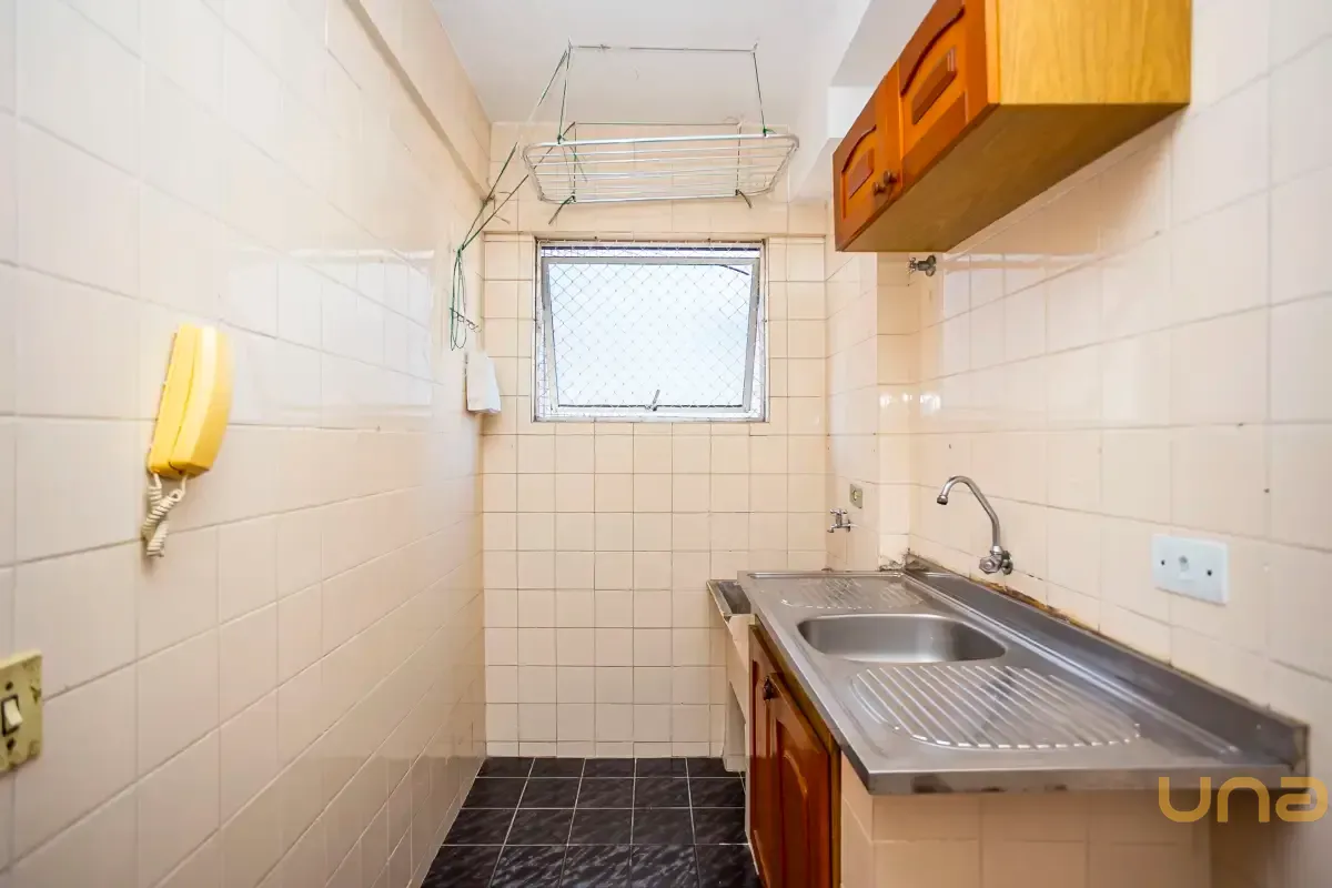 Apartamento com quarto amplo, sala de estar para 2 ambientes, banheiro e cozinha com pia, armário e área de serviço.