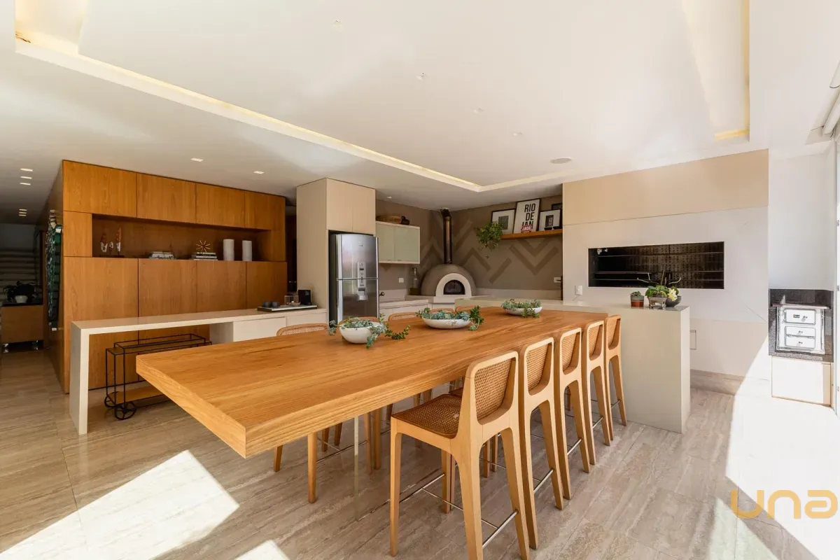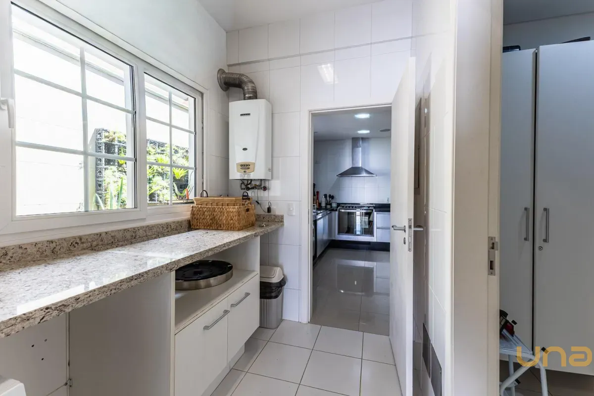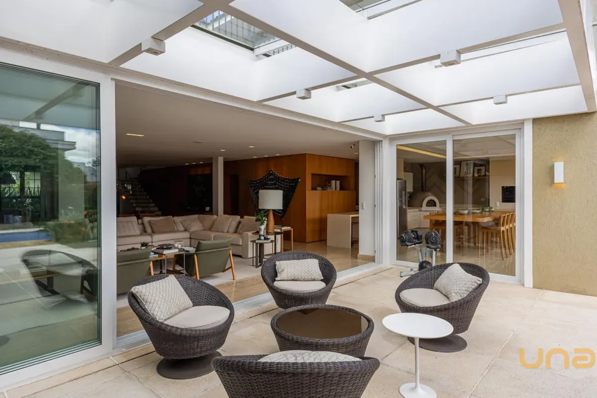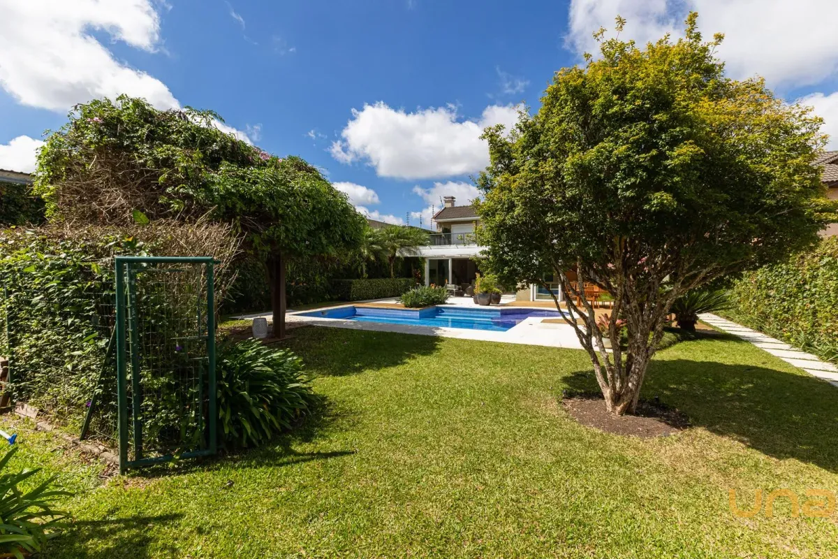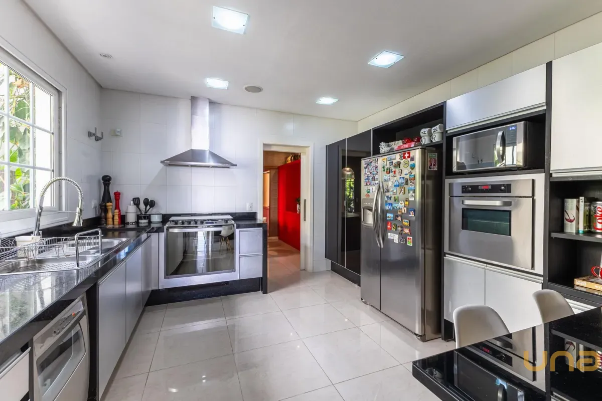 O imóvel conta com um amplo jardim e piscina infantil e adulto. São 5 salas integradas, incluindo 1 sala de estar, 1 sala de jantar, 1 sala de home theater individualizada e uma área gourmet com churrasqueira, forno de pizza, forno de indução e fogão a lenha. Ainda no pavimento térreo há 1 ampla suíte, 2 lavabos (um para visitantes e outro para a área da piscina e gourmet), e uma cozinha espaçosa com despensa. A área de serviço e dependência completa de empregada possuem entrada independente junto à garagem.