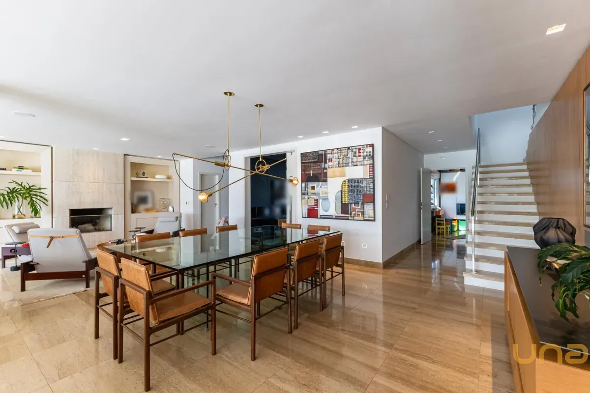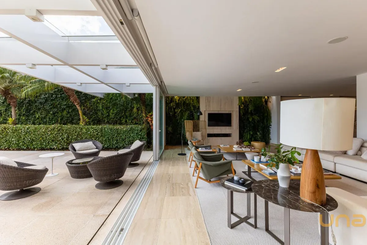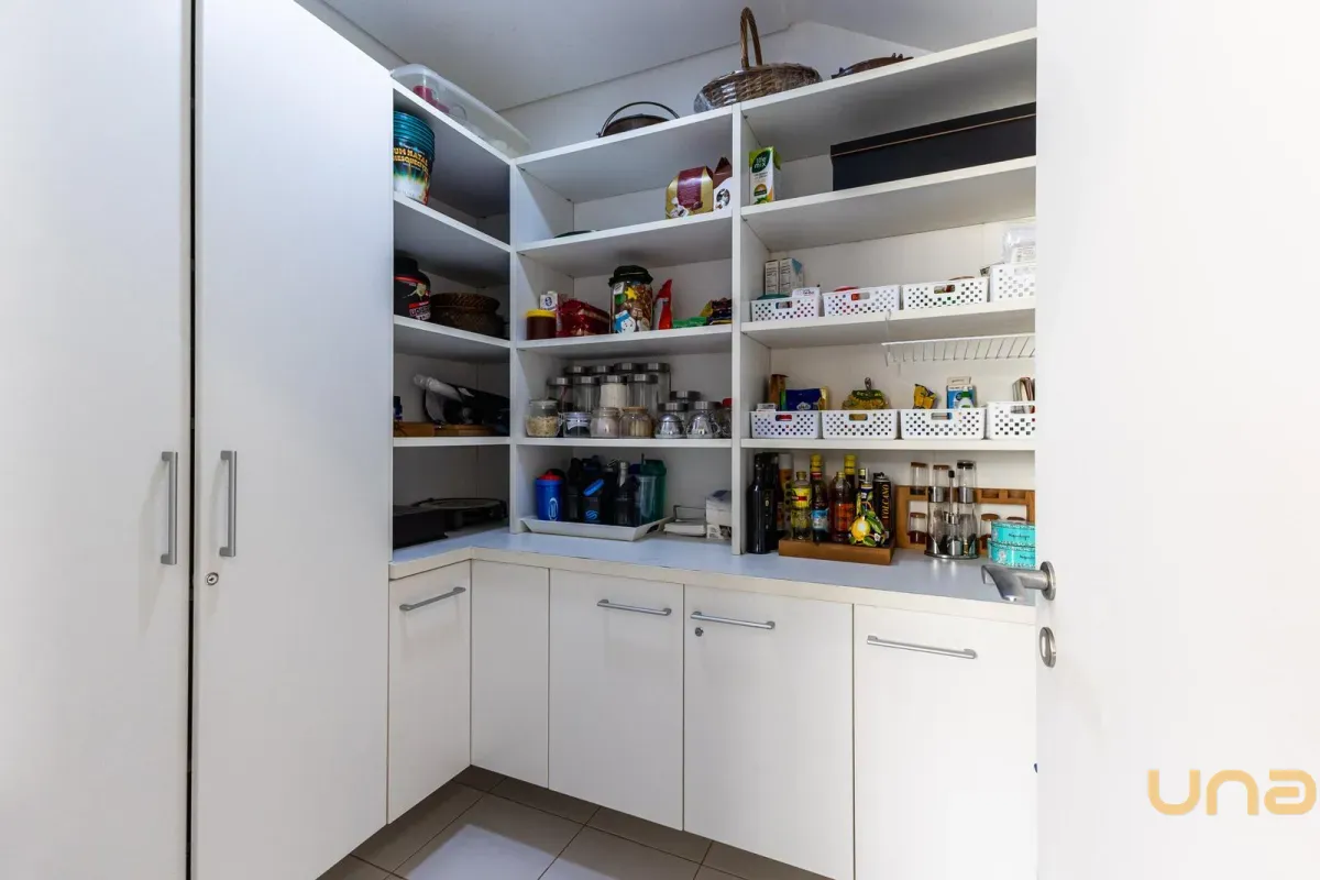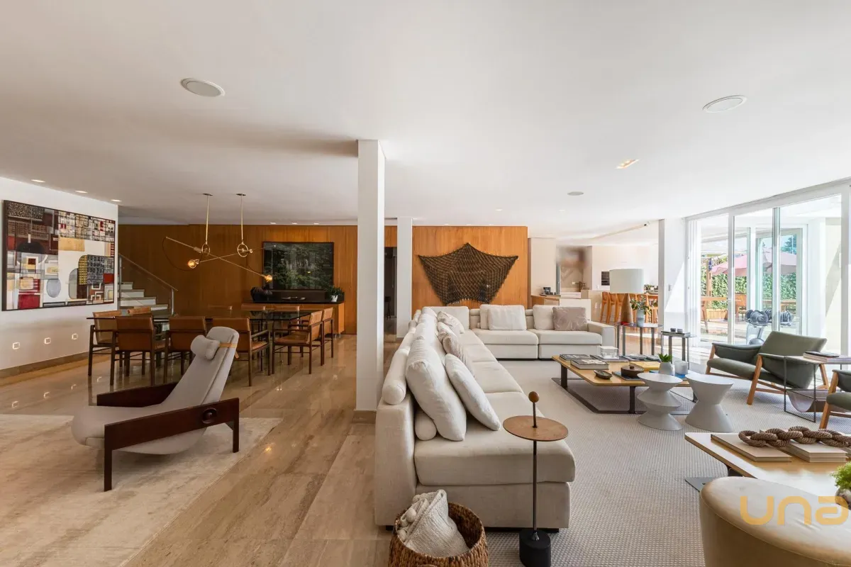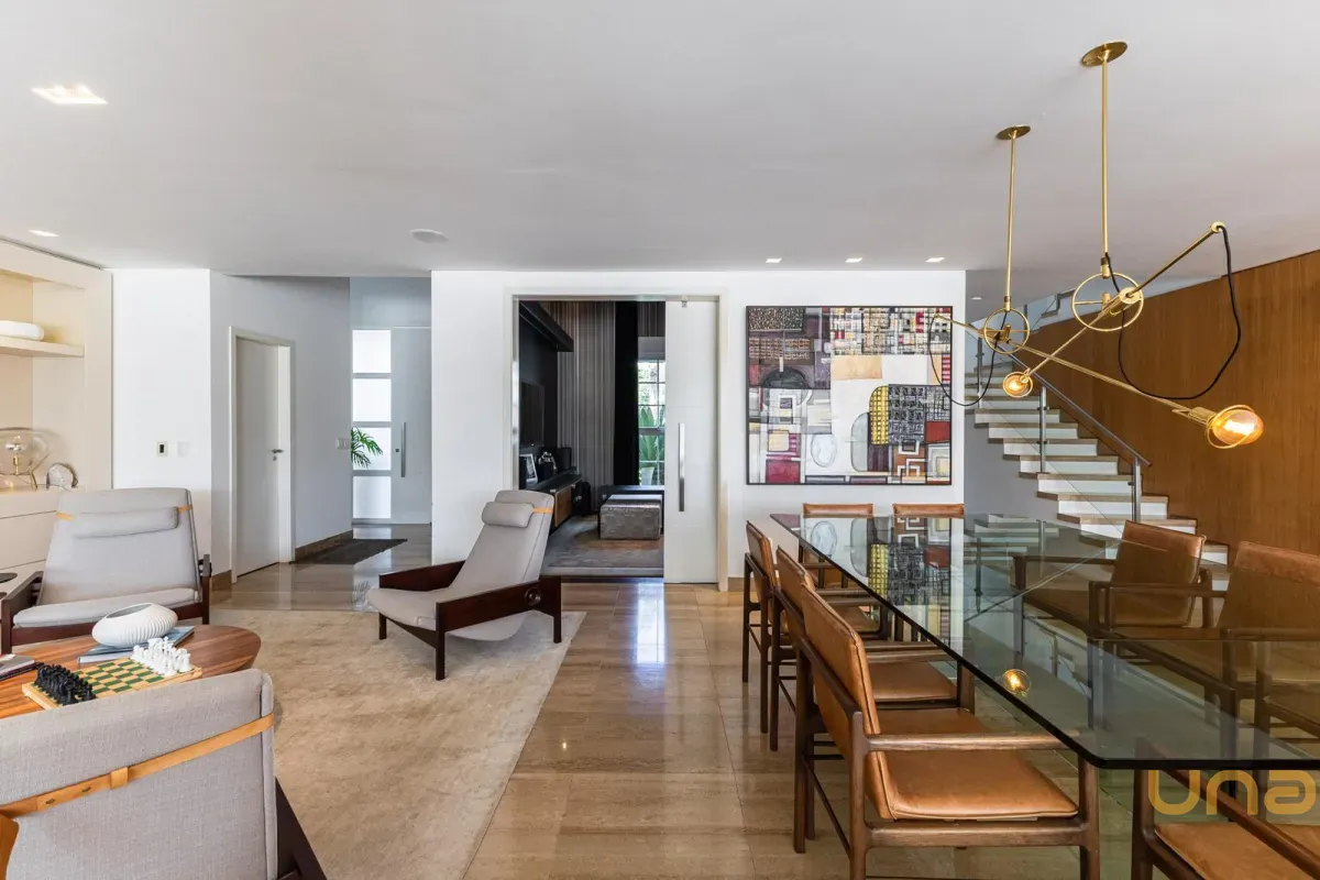 O imóvel conta com um amplo jardim e piscina infantil e adulto. São 5 salas integradas, incluindo 1 sala de estar, 1 sala de jantar, 1 sala de home theater individualizada e uma área gourmet com churrasqueira, forno de pizza, forno de indução e fogão a lenha. Ainda no pavimento térreo há 1 ampla suíte, 2 lavabos (um para visitantes e outro para a área da piscina e gourmet), e uma cozinha espaçosa com despensa. A área de serviço e dependência completa de empregada possuem entrada independente junto à garagem.