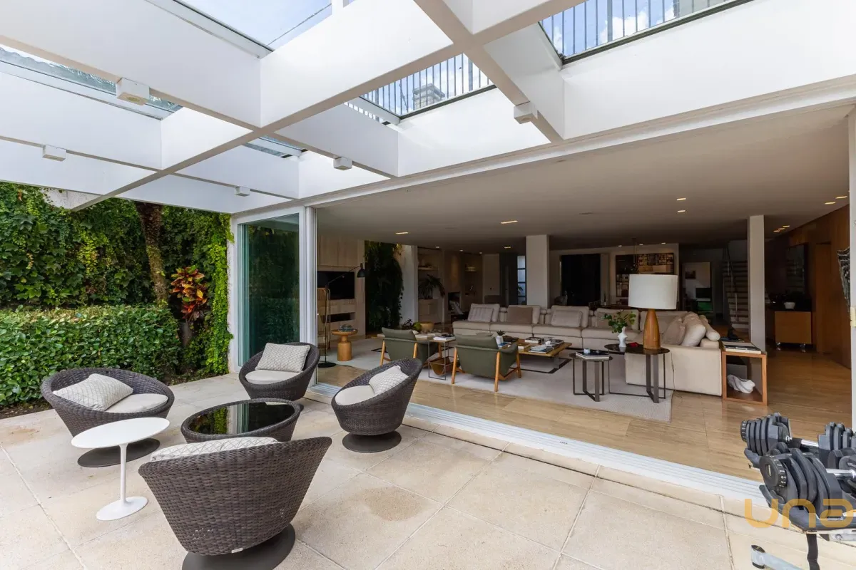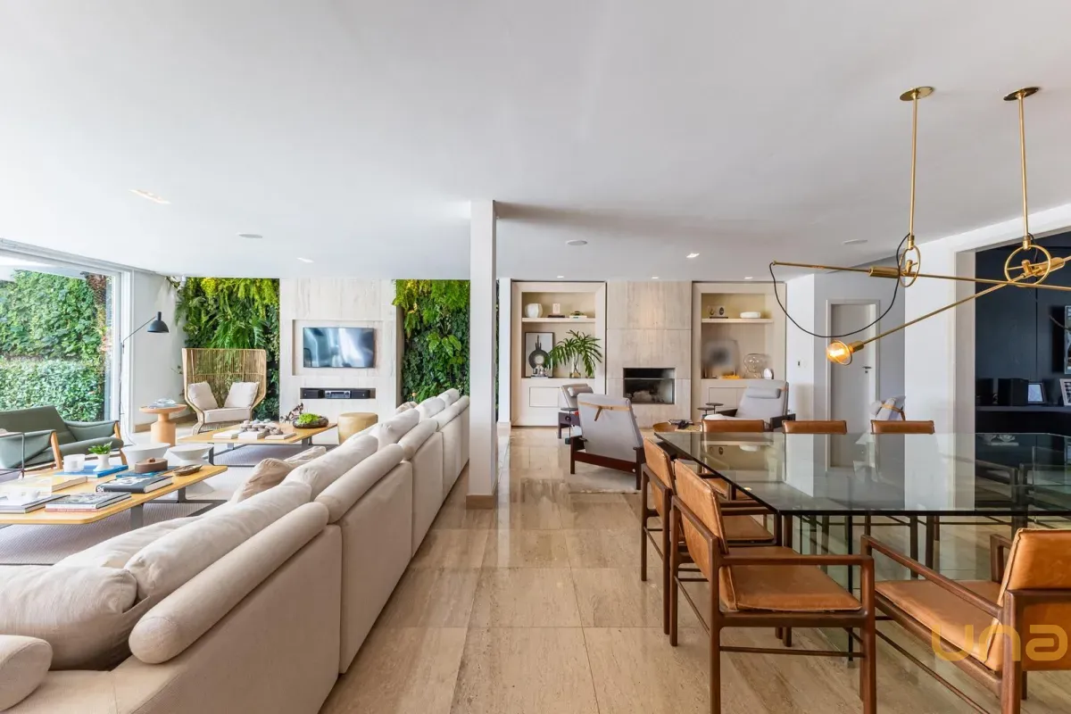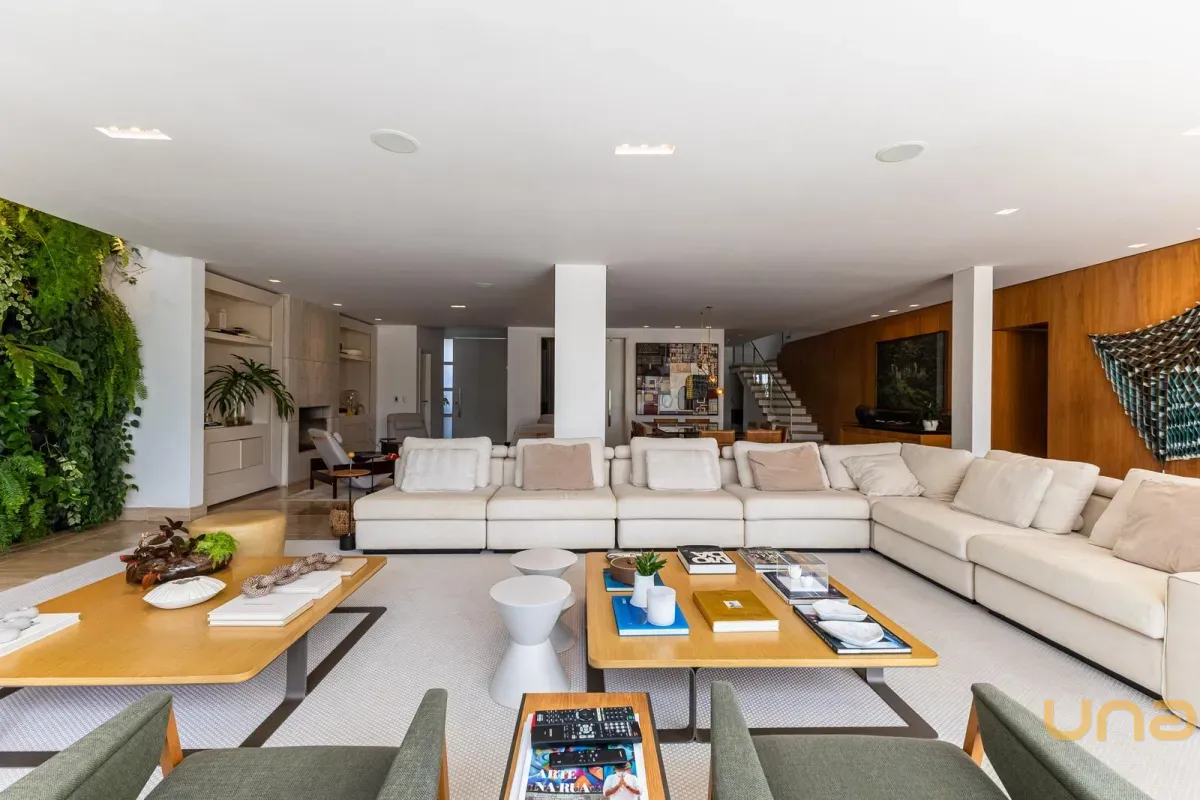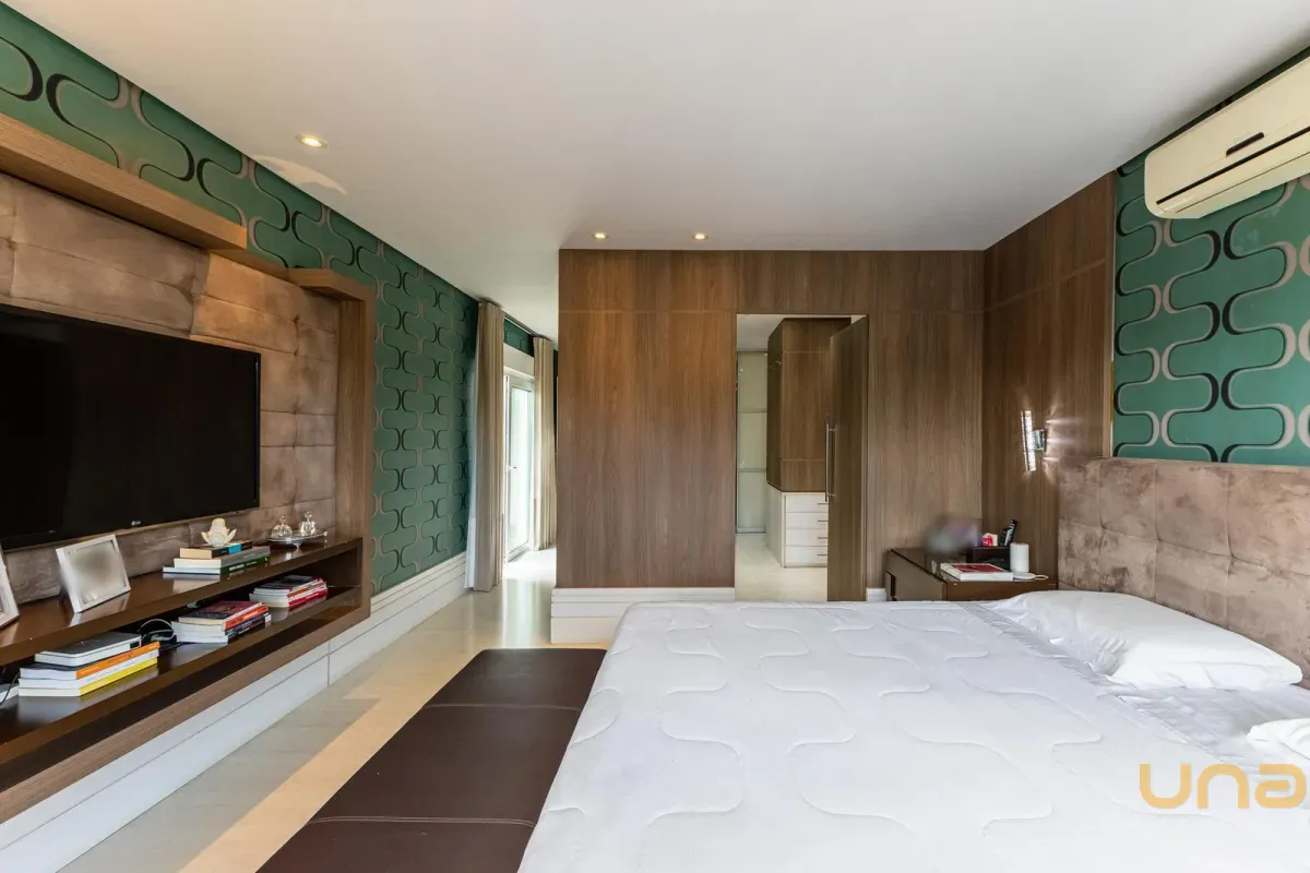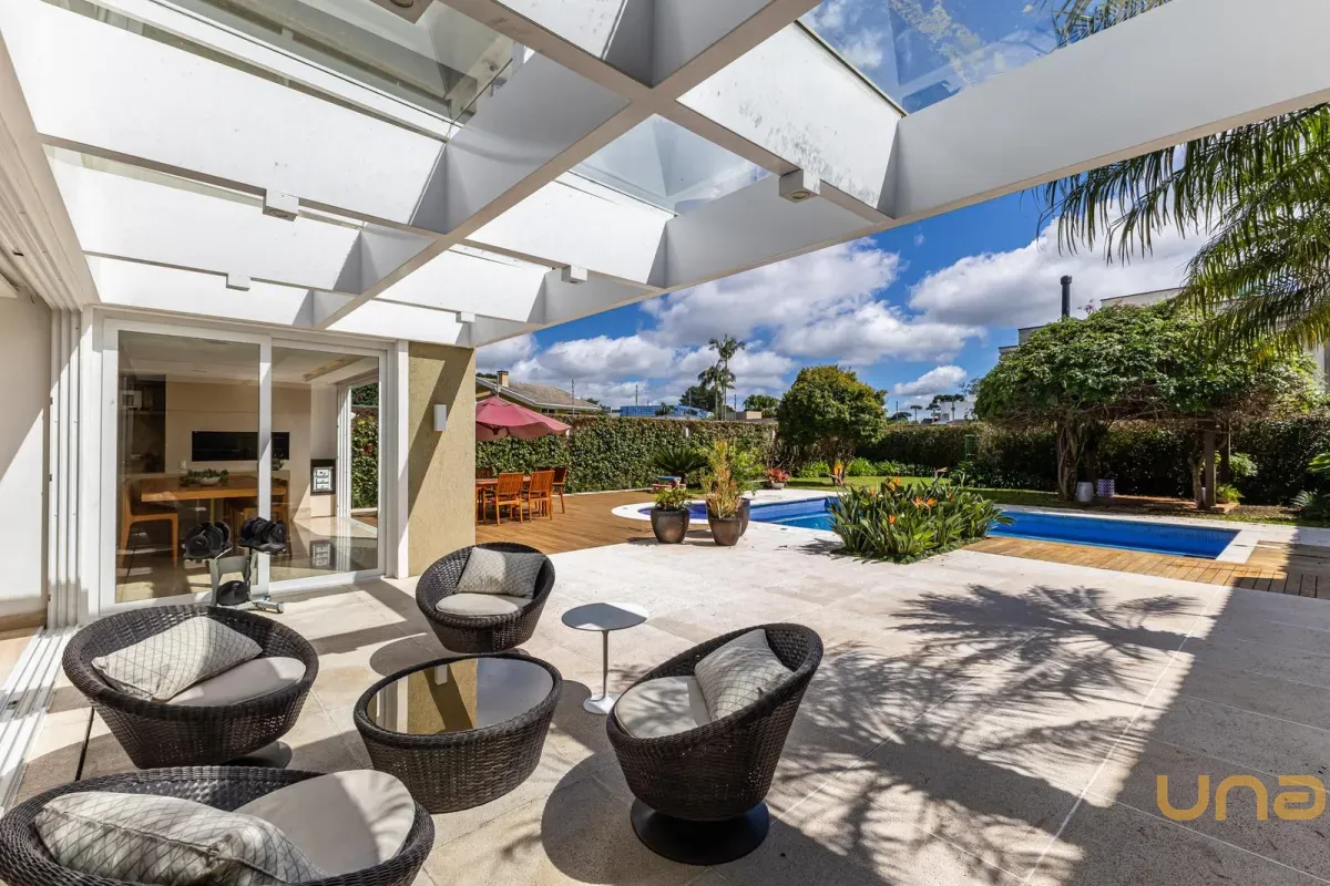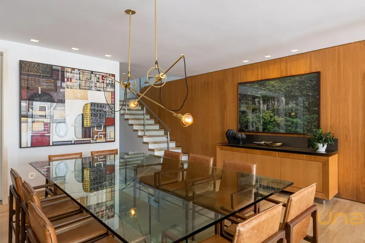 O imóvel conta com um amplo jardim e piscina infantil e adulto. São 5 salas integradas, incluindo 1 sala de estar, 1 sala de jantar, 1 sala de home theater individualizada e uma área gourmet com churrasqueira, forno de pizza, forno de indução e fogão a lenha. Ainda no pavimento térreo há 1 ampla suíte, 2 lavabos (um para visitantes e outro para a área da piscina e gourmet), e uma cozinha espaçosa com despensa. A área de serviço e dependência completa de empregada possuem entrada independente junto à garagem.