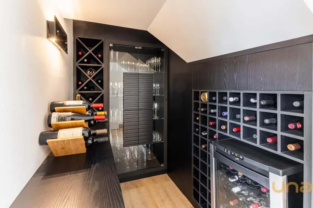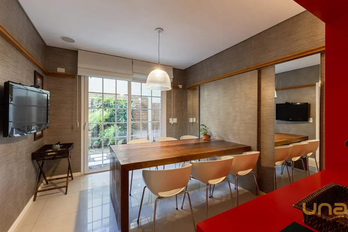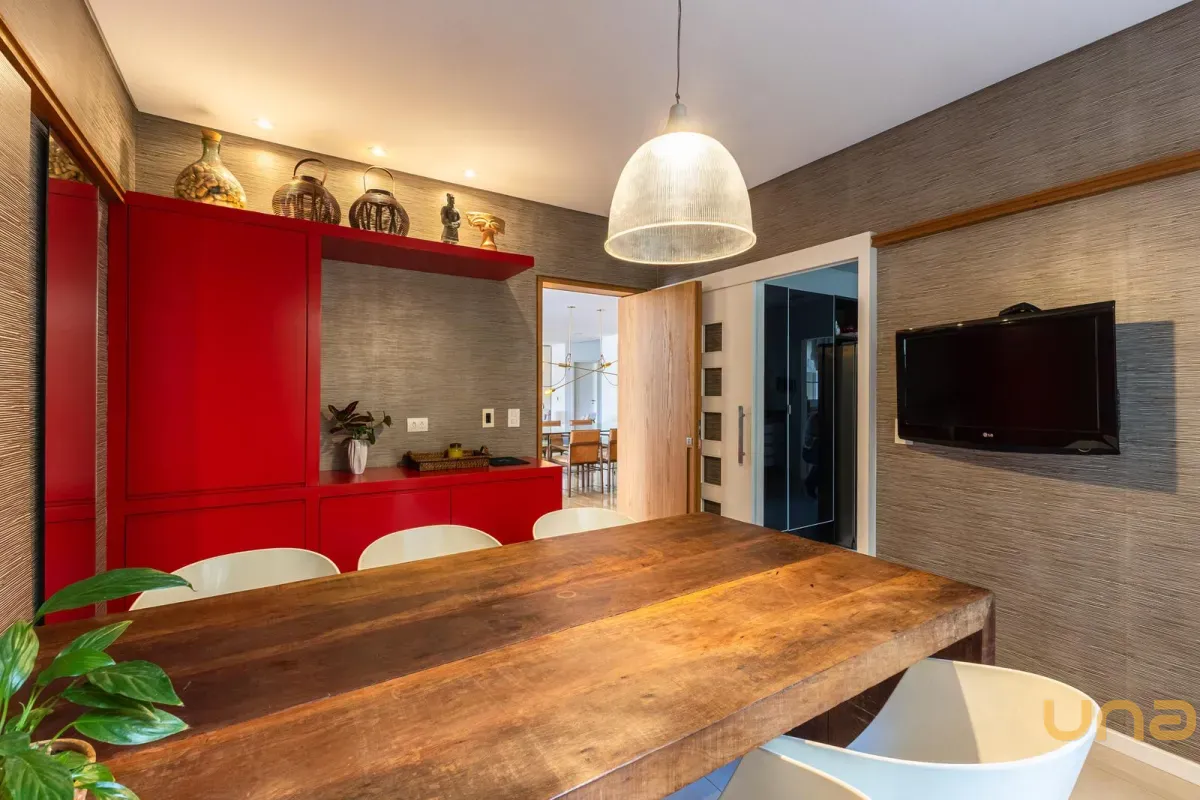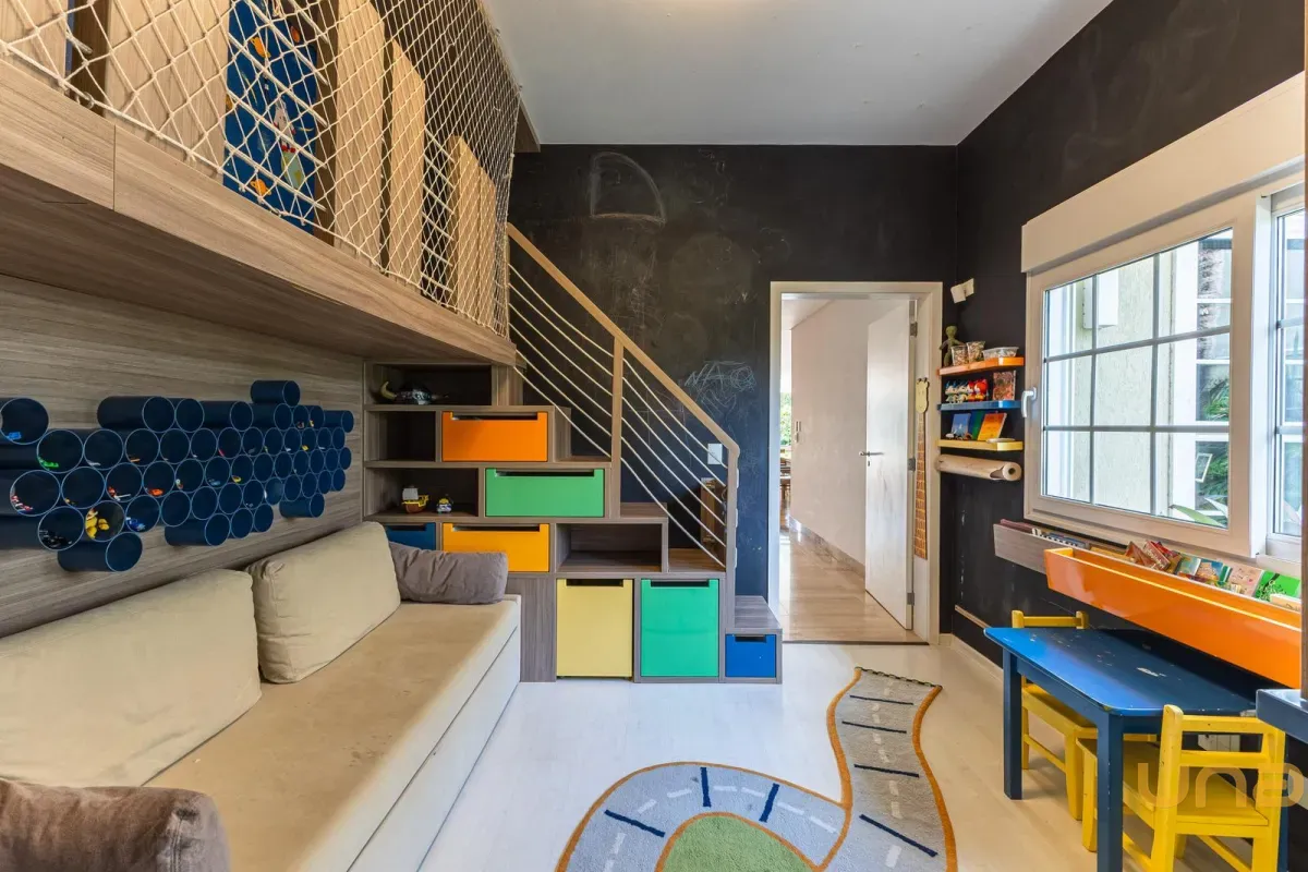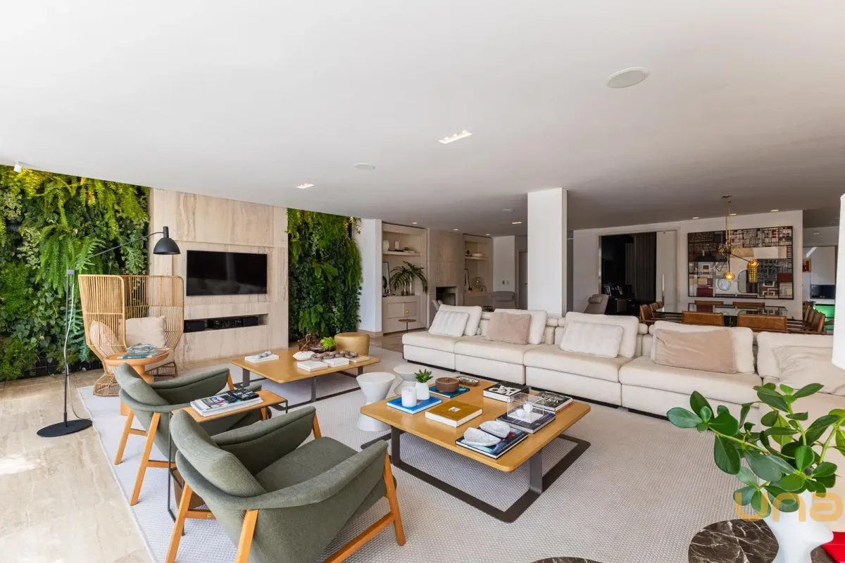 O imóvel conta com um amplo jardim e piscina infantil e adulto. São 5 salas integradas, incluindo 1 sala de estar, 1 sala de jantar, 1 sala de home theater individualizada e uma área gourmet com churrasqueira, forno de pizza, forno de indução e fogão a lenha. Ainda no pavimento térreo há 1 ampla suíte, 2 lavabos (um para visitantes e outro para a área da piscina e gourmet), e uma cozinha espaçosa com despensa. A área de serviço e dependência completa de empregada possuem entrada independente junto à garagem.