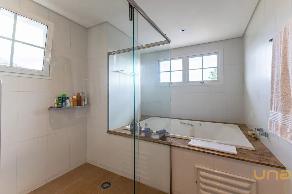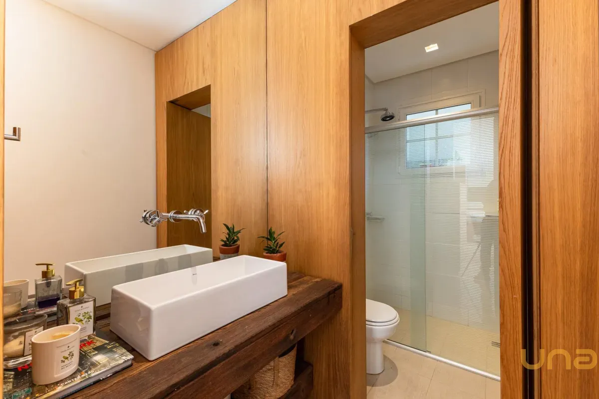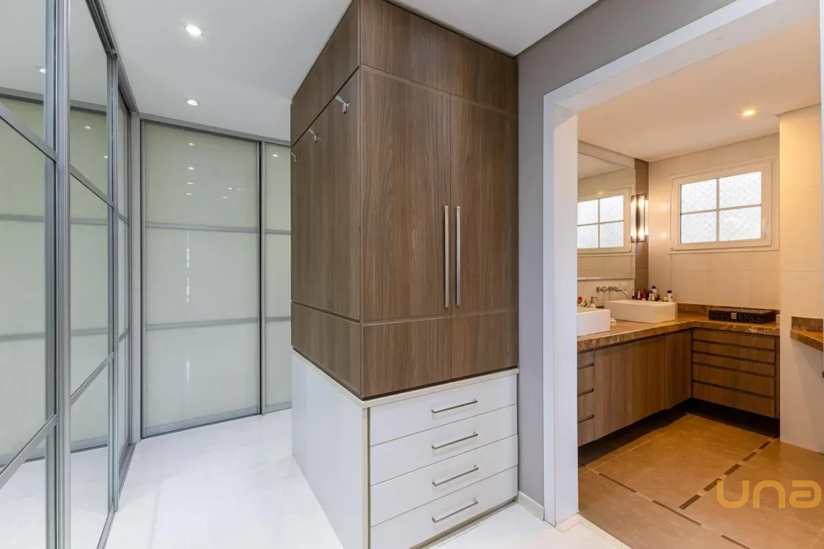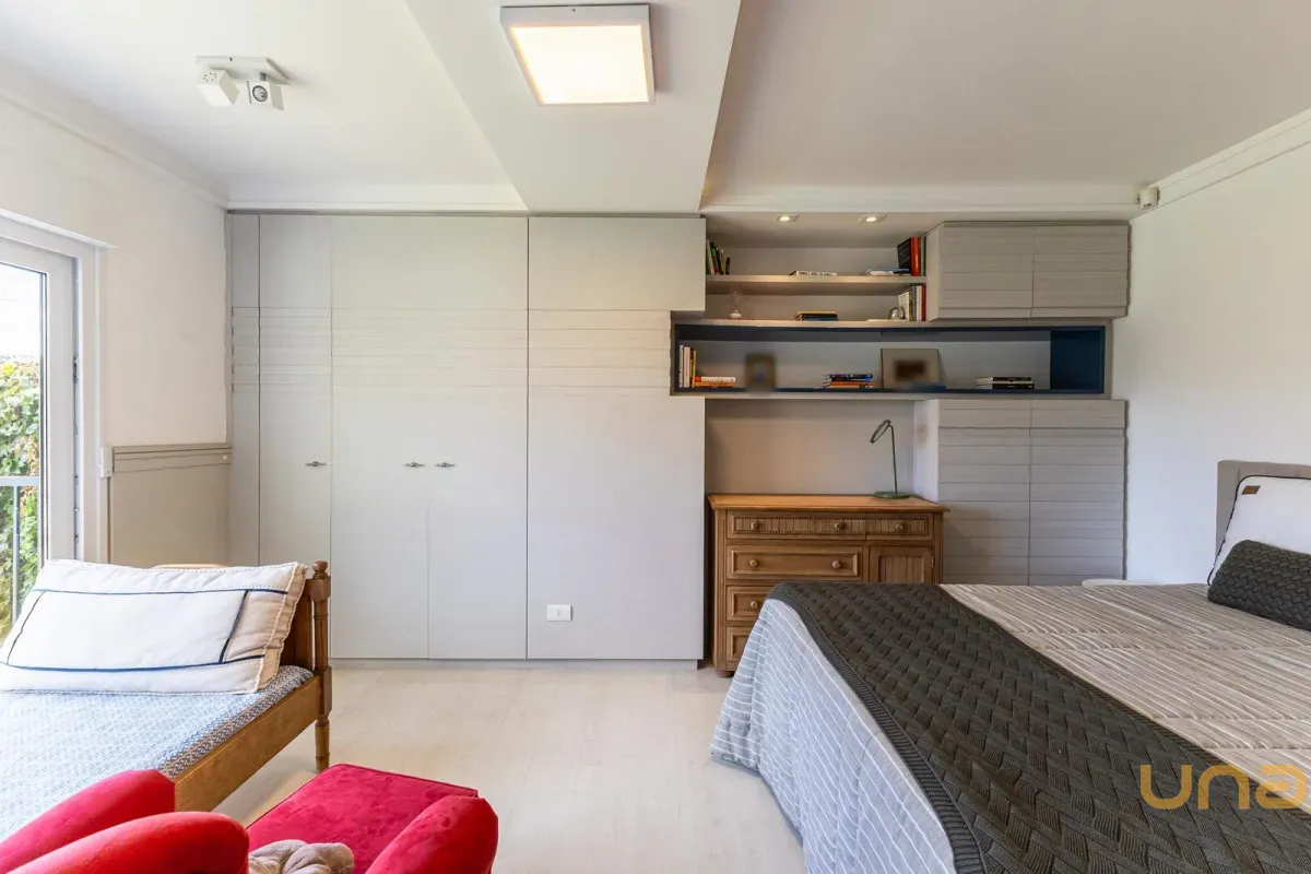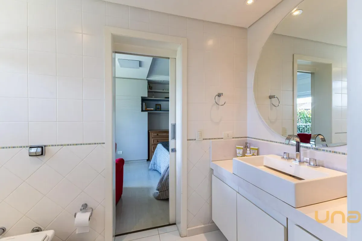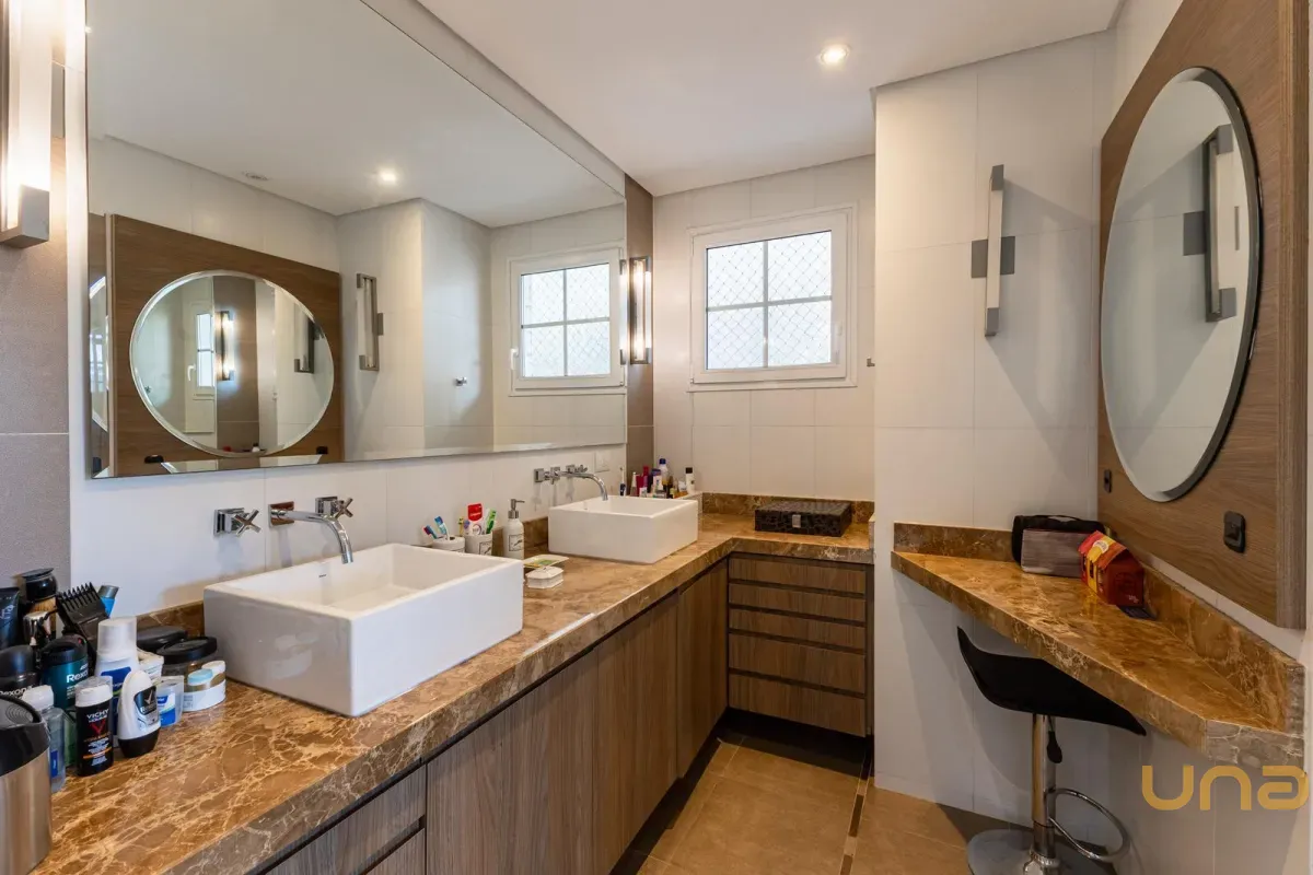 No pavimento superior, a casa dispõe de 3 quartos, sendo 1 suíte master com closet, banheiro individualizado com espaço para maquiagem e banheira, além de sacada. Há também 2 demi-suítes com banheiro de uso comum e um dos quartos com sacada. A circulação conta com um amplo roupeiro.