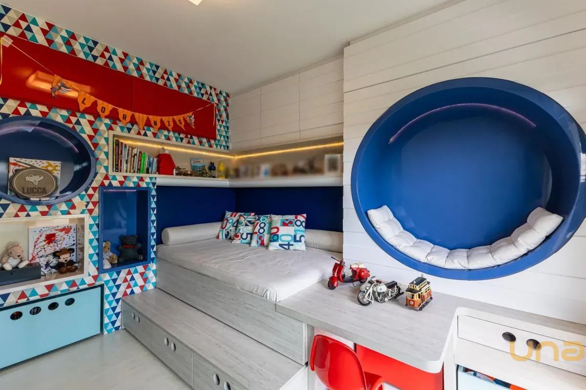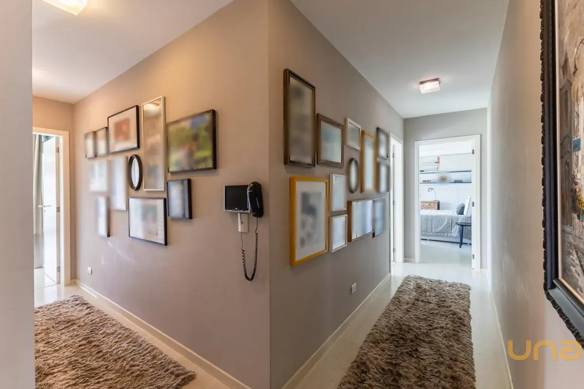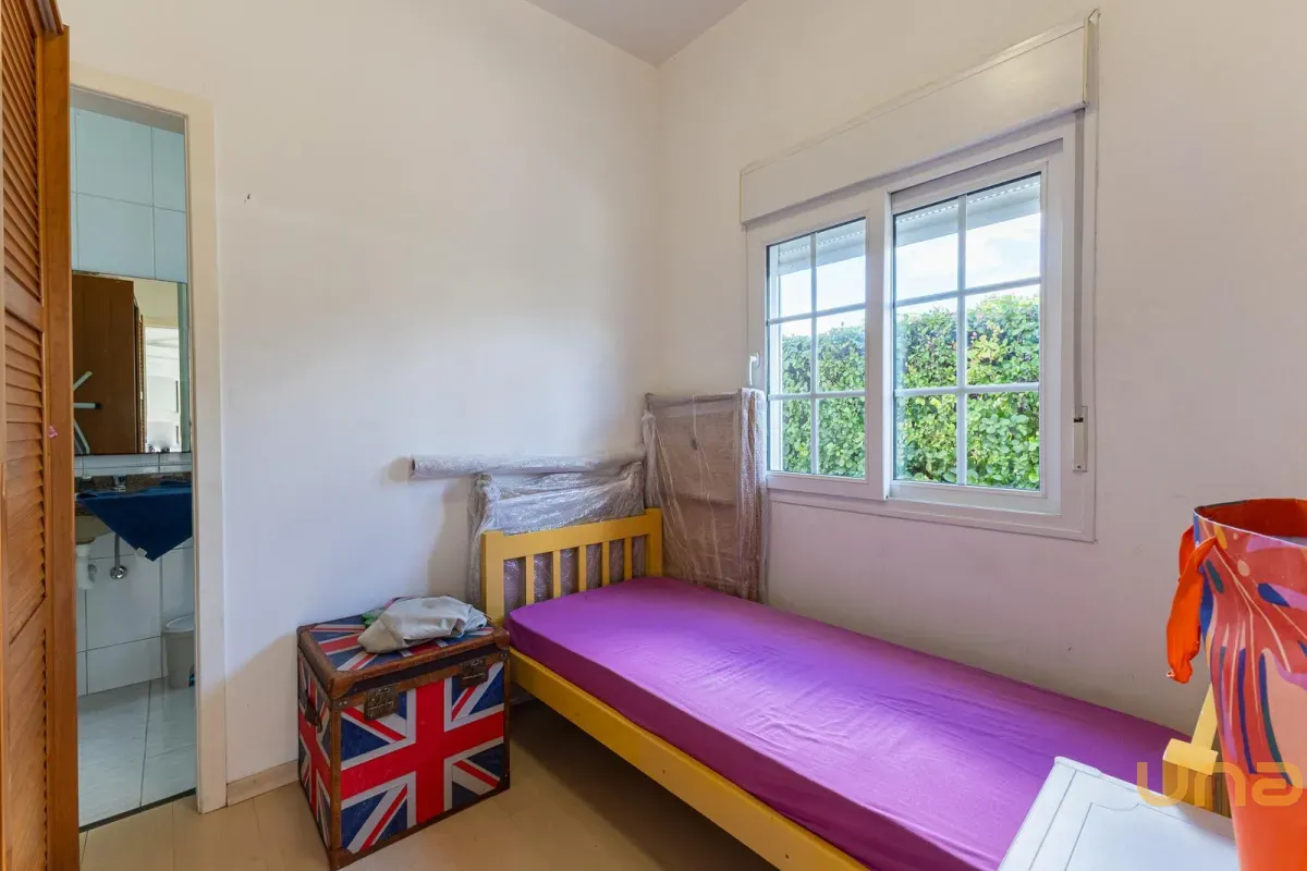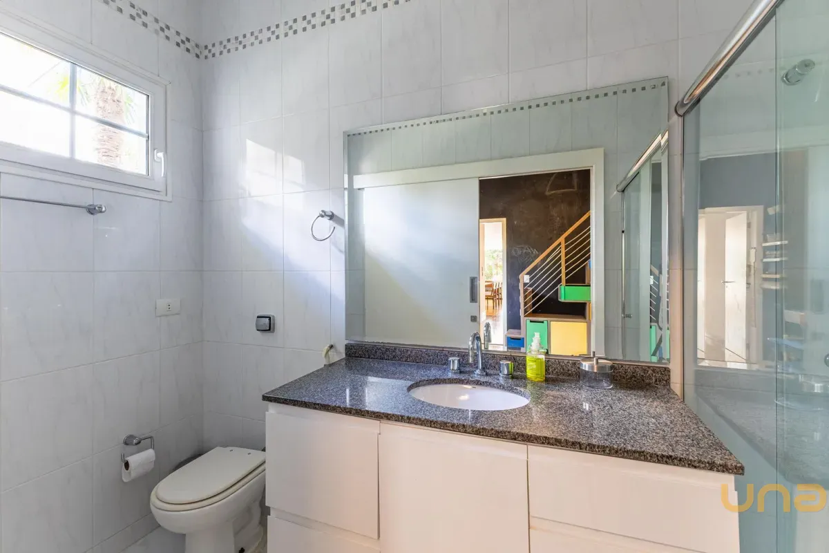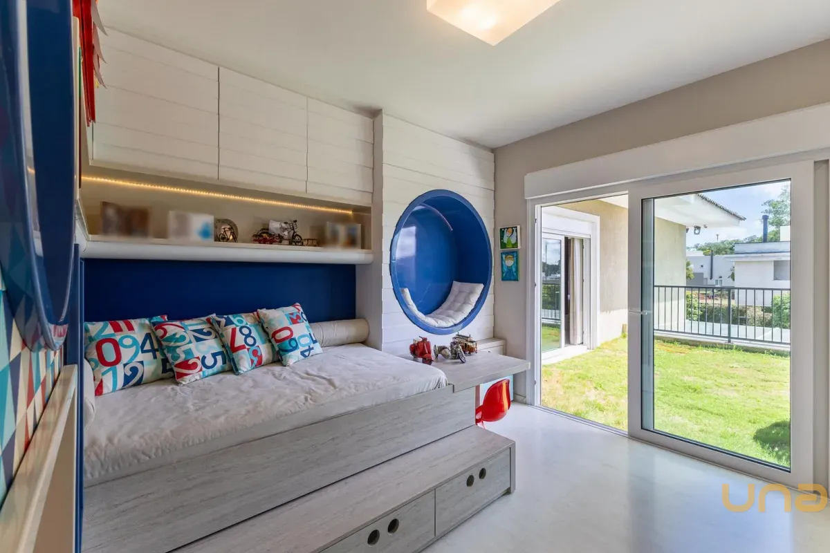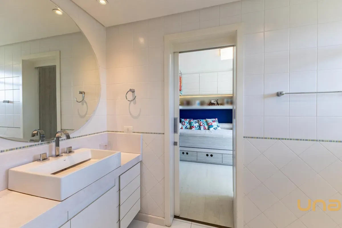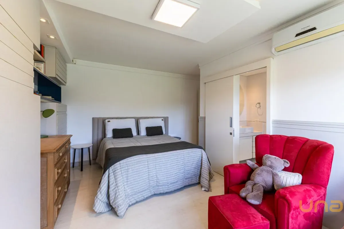No pavimento superior, a casa dispõe de 3 quartos, sendo 1 suíte master com closet, banheiro individualizado com espaço para maquiagem e banheira, além de sacada. Há também 2 demi-suítes com banheiro de uso comum e um dos quartos com sacada. A circulação conta com um amplo roupeiro.