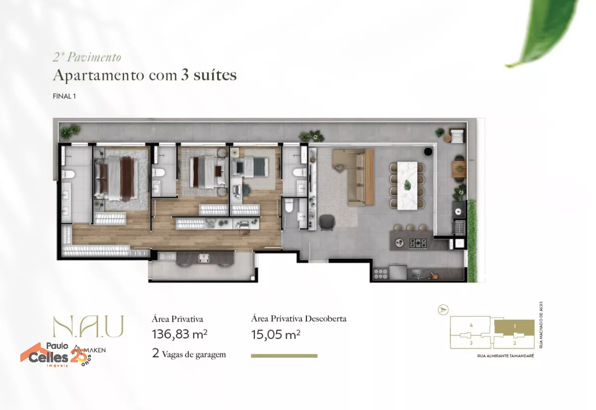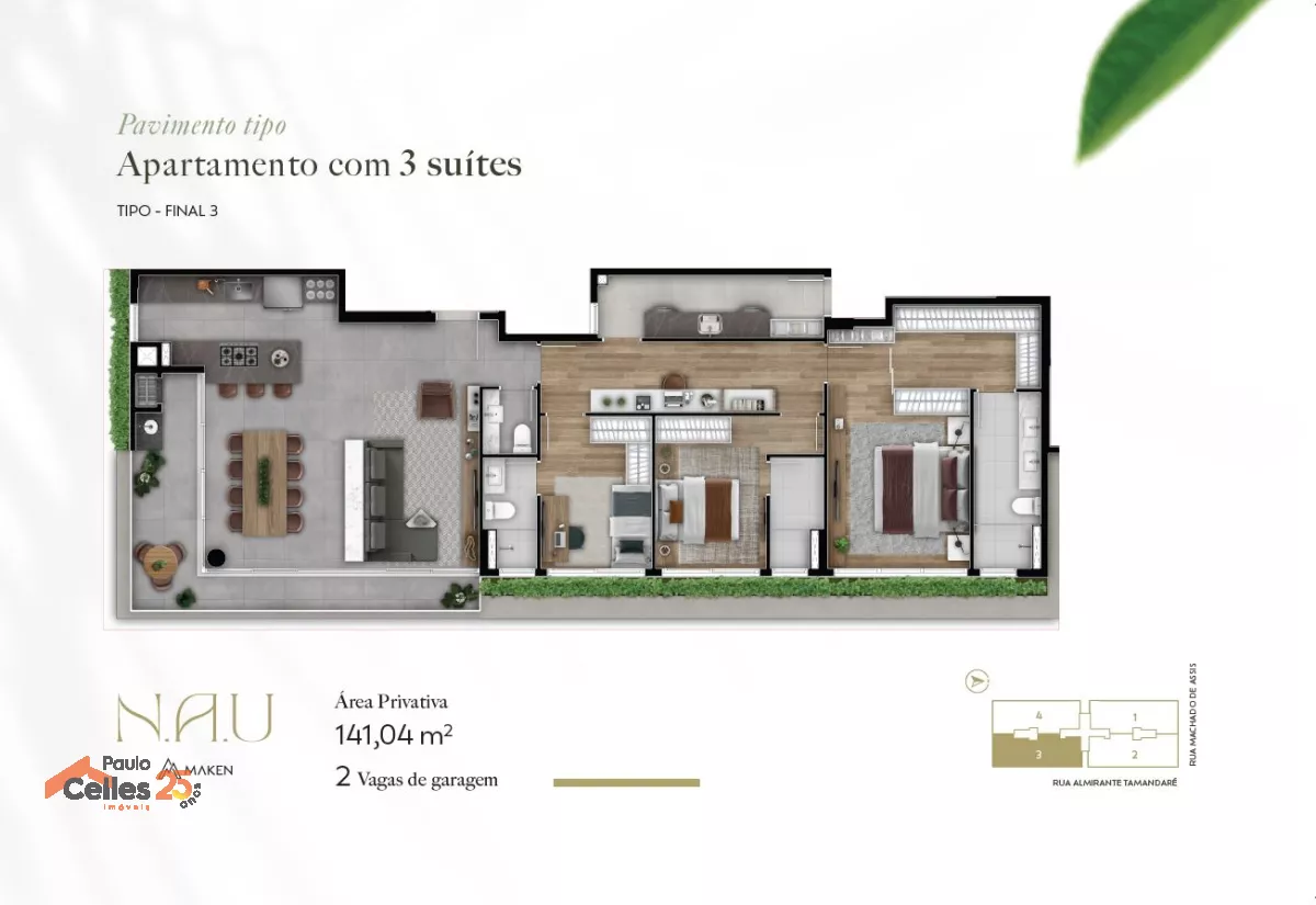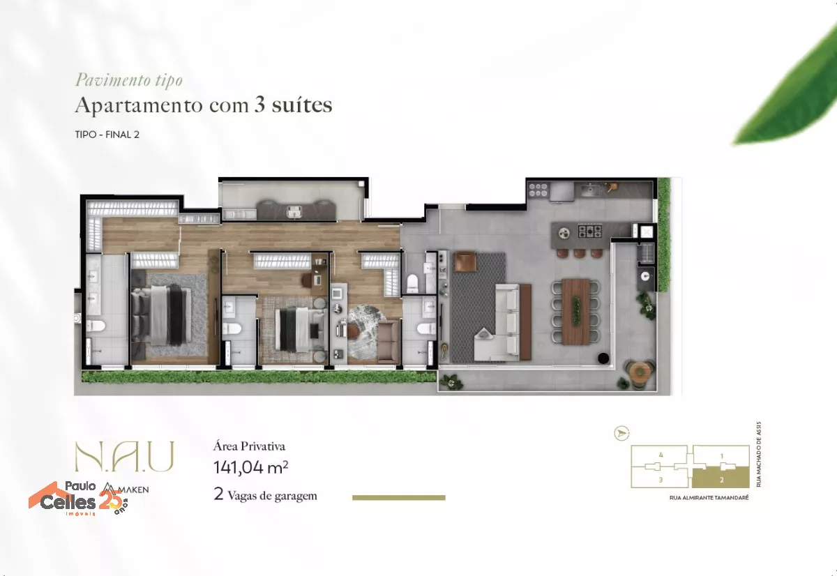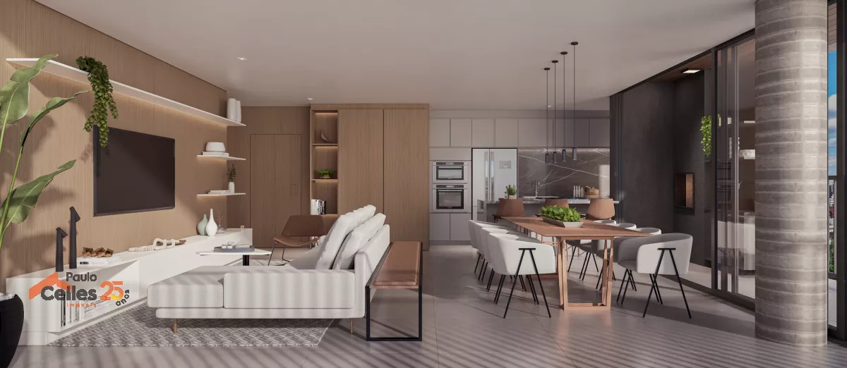 Apartamento com 141,04m² privativos, 3 suítes, ampla sala para 2 ambientes, sacada com churrasqueira e 2 vagas de garagem.