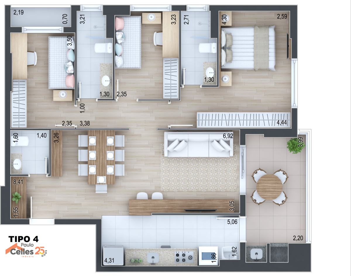 Apartamento com 3 quartos (1 suíte), ampla sala para dois ambientes, sacada com churrasqueira a carvão, infraestrutura para ar-condicionado nos quartos e na sala, esquadrias com persianas integradas e automatizadas nos dormitórios, além de 2 vagas de garagem.