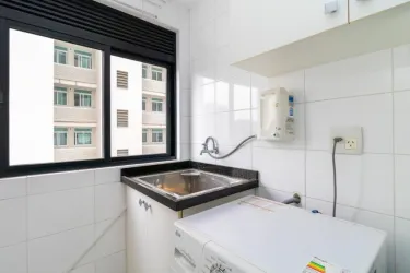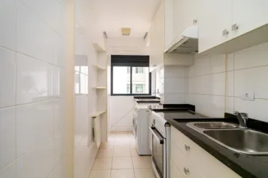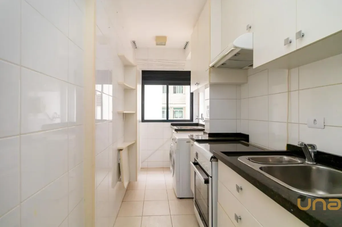 A cozinha é funcional e moderna, com armários planejados, geladeira e fogão, conectando-se à área de serviço. O apartamento dispõe ainda de banheiro social e 2 vagas de garagem cobertas.