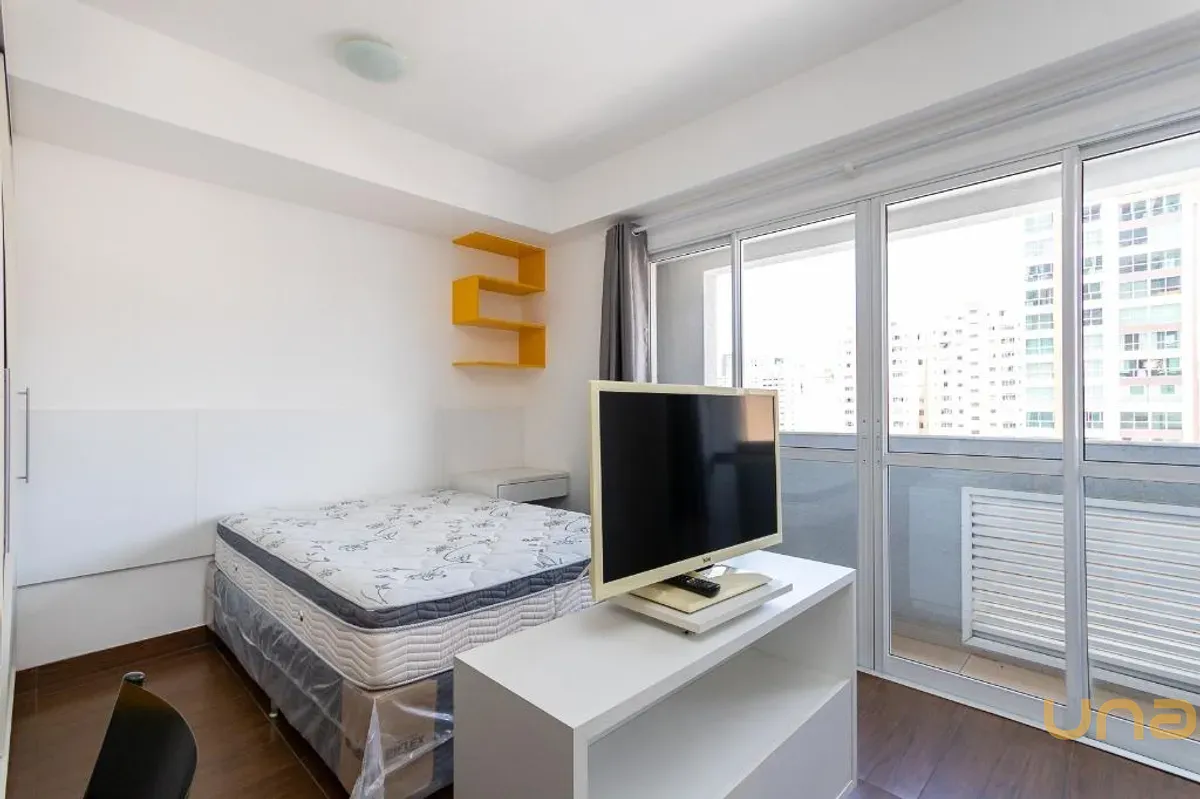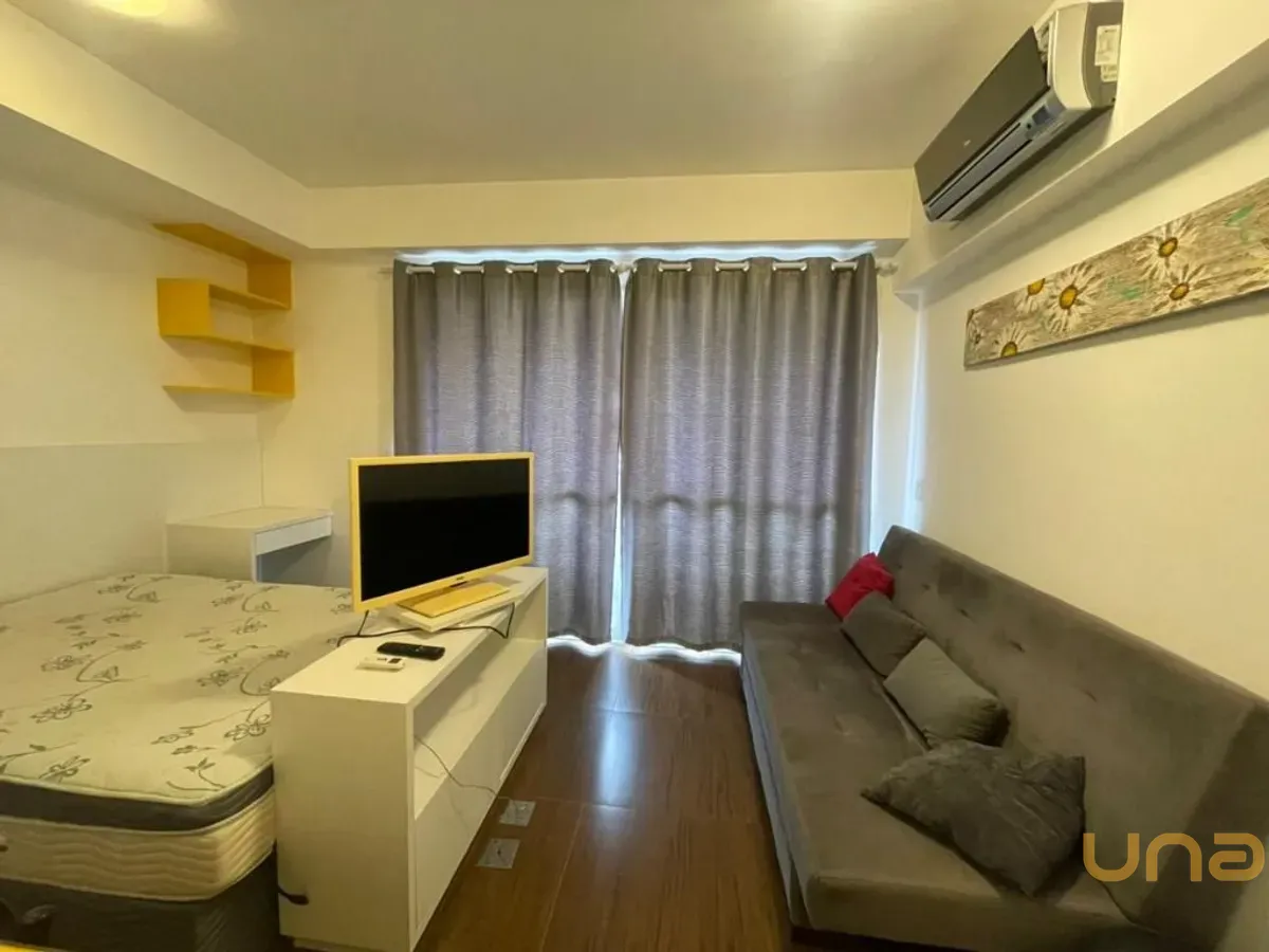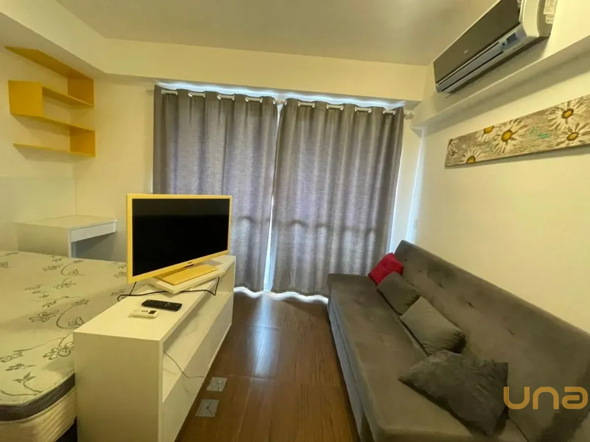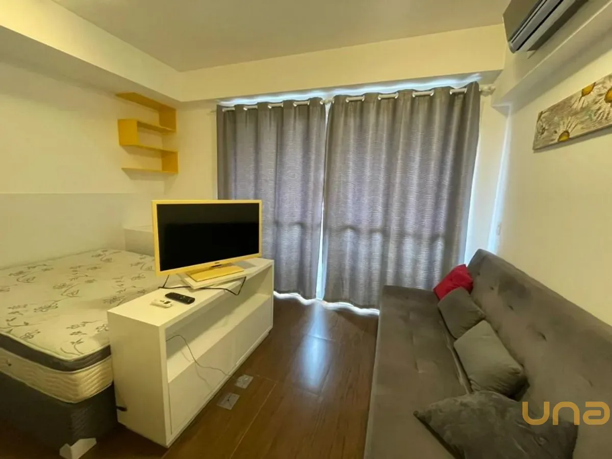 º Sala/quarto com sofá, cama box, guarda-roupas e TV