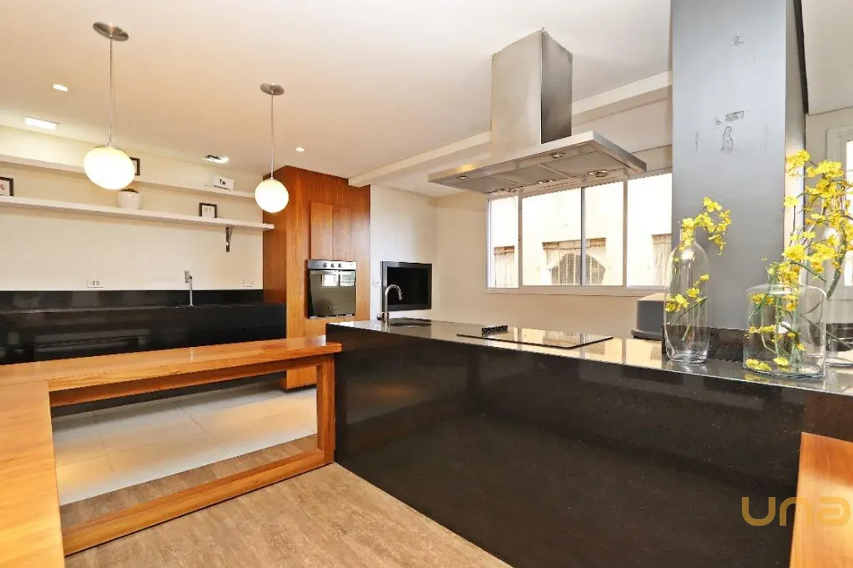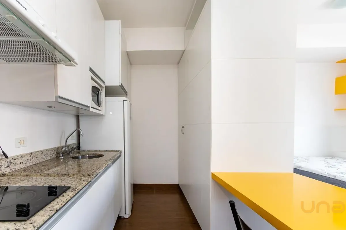 º Cozinha com fogão cooktop, microondas, geladeira, exaustor e mesa para copa