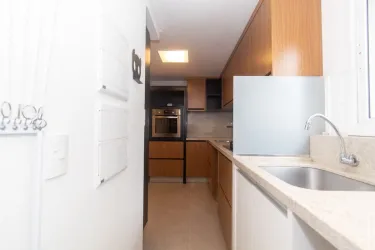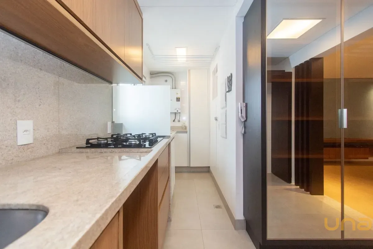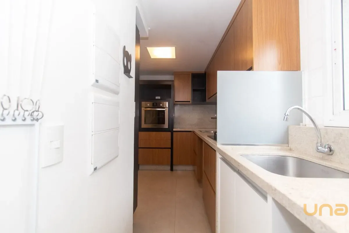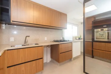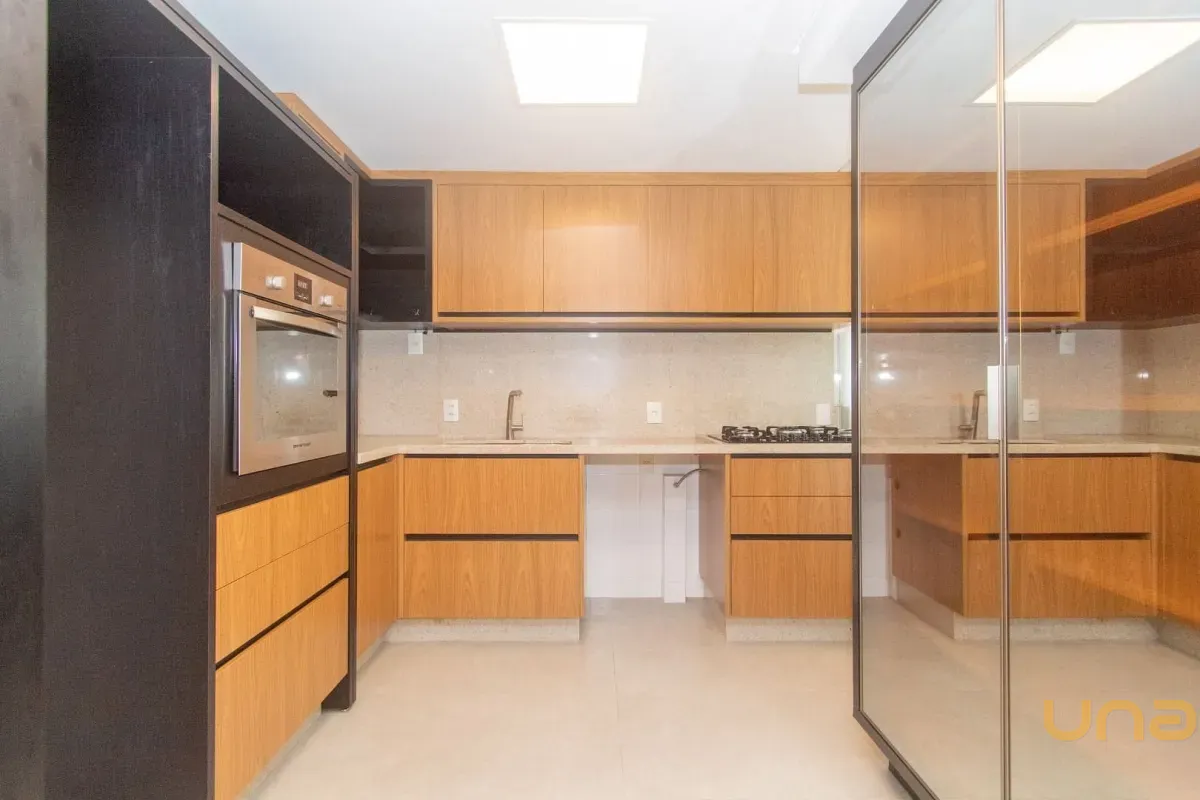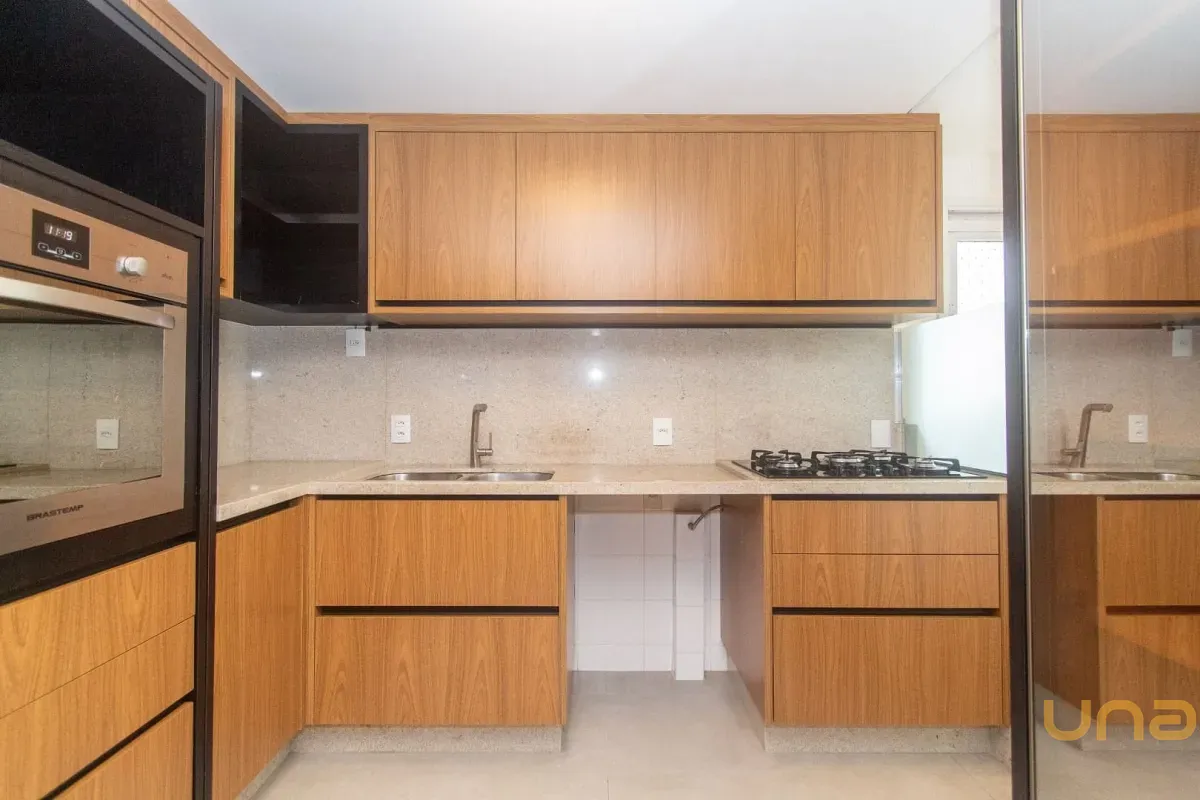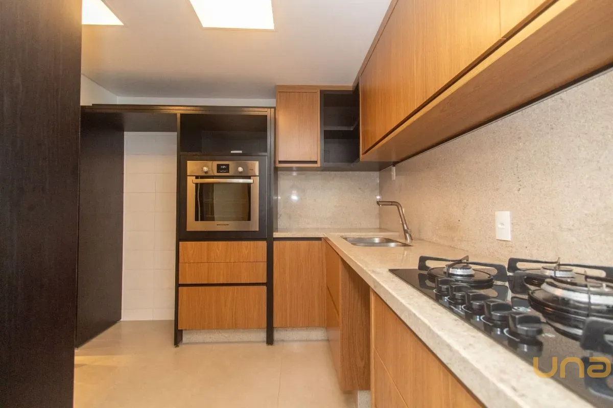 - Cozinha planejada com armários e forno embutido.
