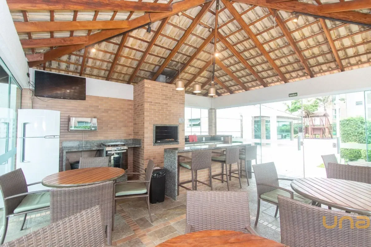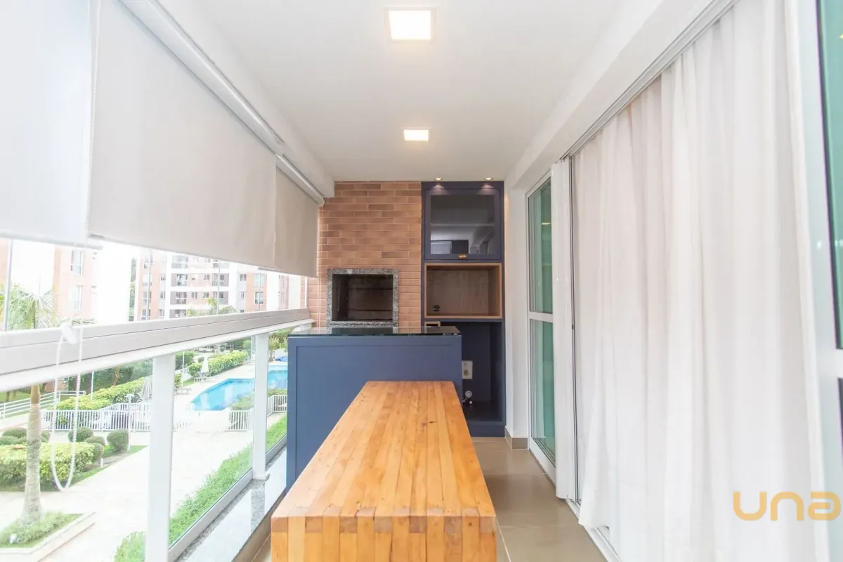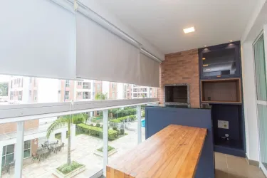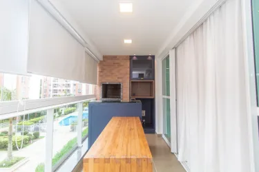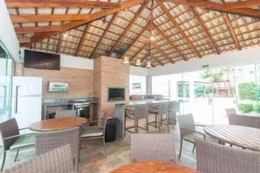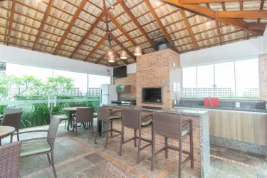 - Sacada com churrasqueira, armários e bancada de apoio;