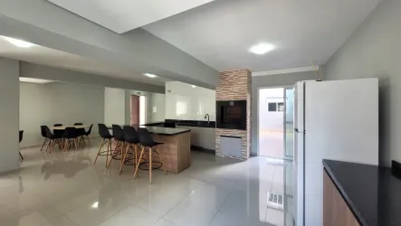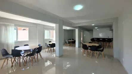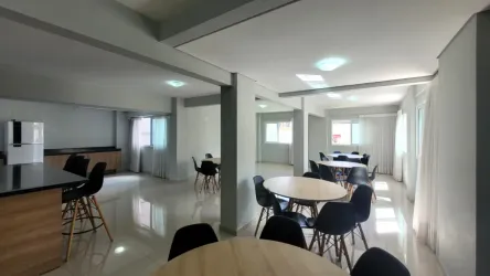 O imóvel conta 2 quartos, sendo 1 suíte, sala ampla para dois ambientes, banheiro social com armário e box de vidro, além de cozinha com armário e área de serviço integradas.