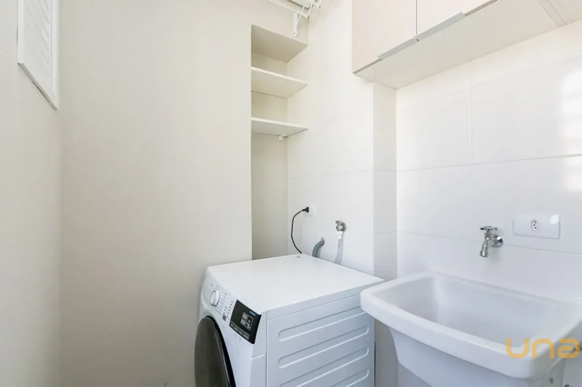 Lavanderia integrada à cozinha, com armário, tanque e máquina lava e seca;