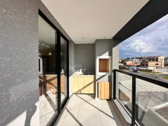 * Sala de dois ambientes e cozinha integrada, com sacada dispondo de churrasqueira e piso em porcelanato;