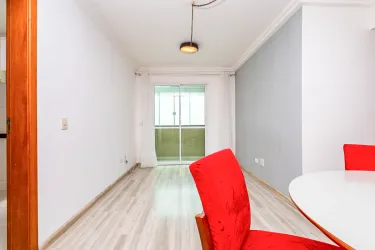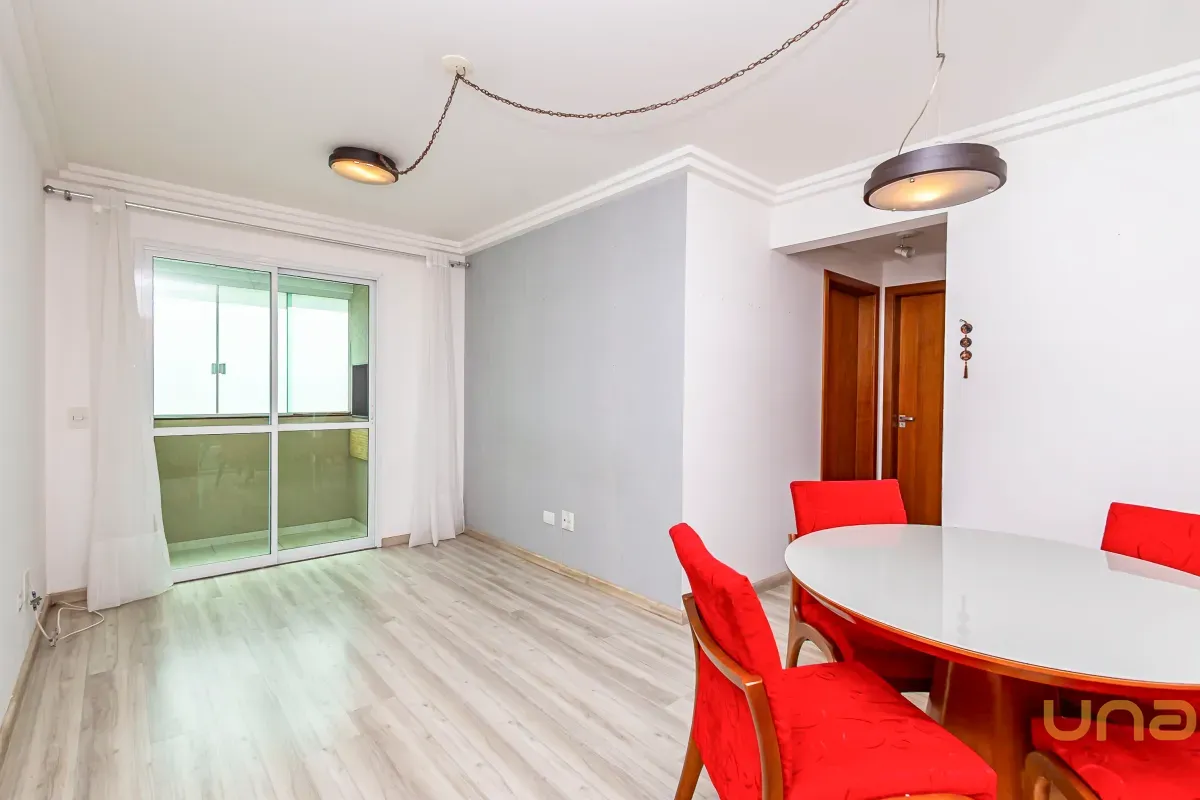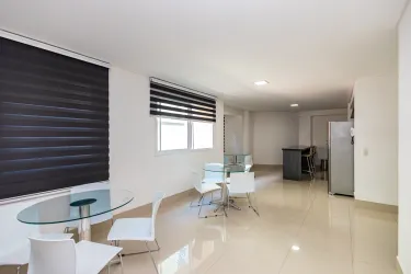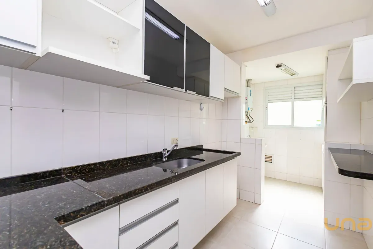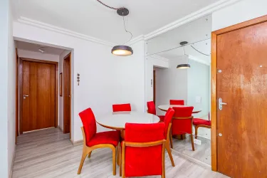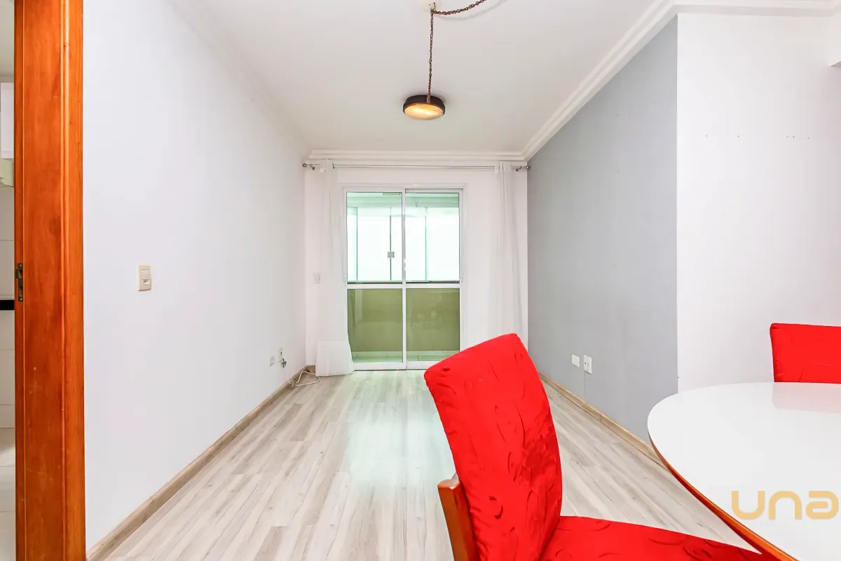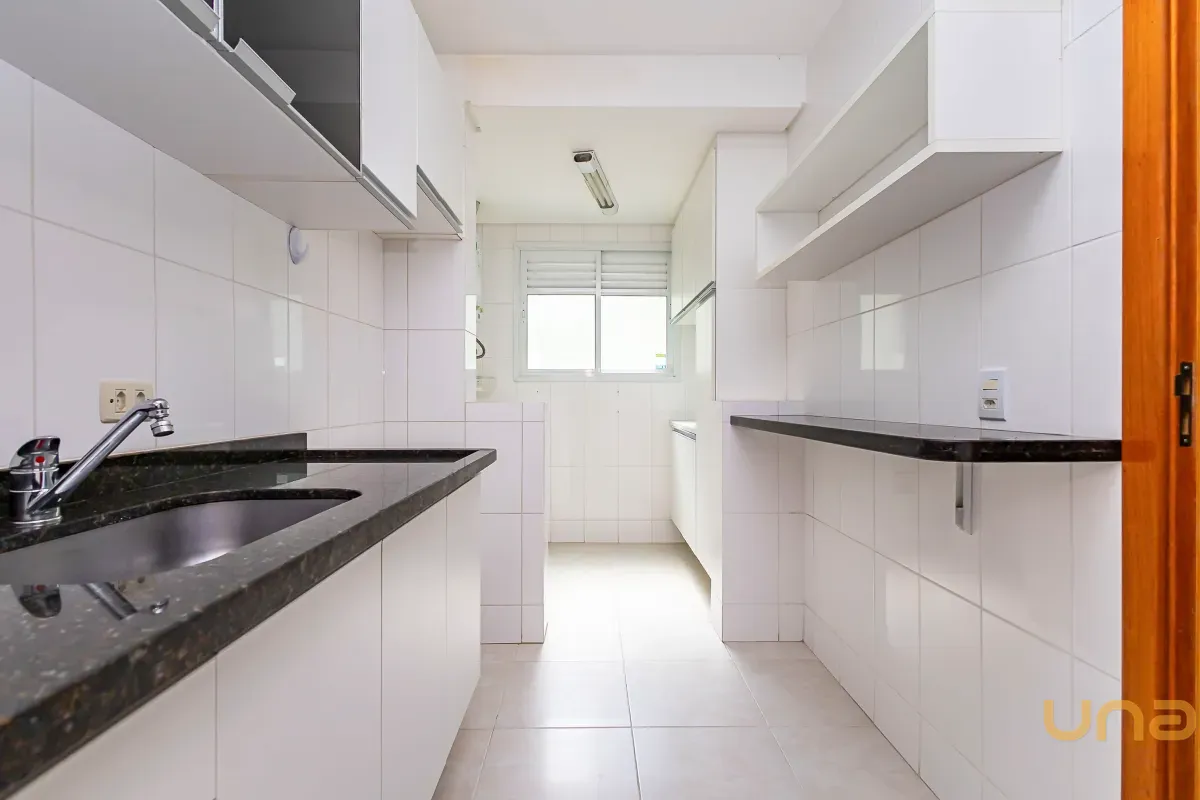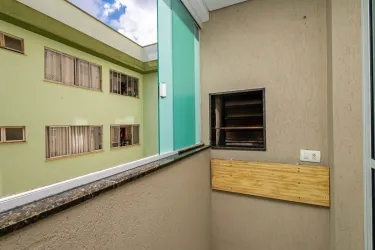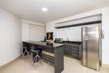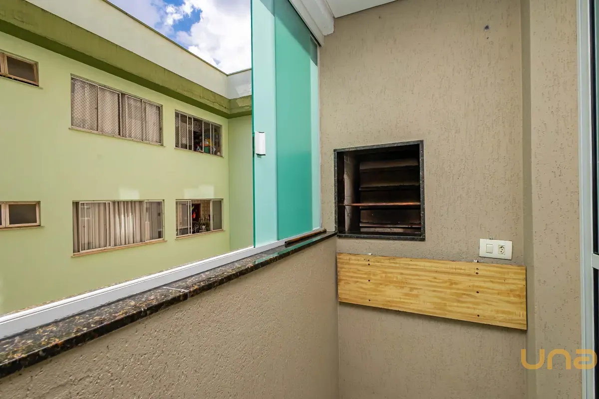 Sala para 02 ambientes com mesa para 4 lugares com sacada com churrasqueira a carvão, 02 quartos com armários sendo 01 deles com iluminação de led e espelhos, cozinha com armários com tampo de granito, área de serviços, banheiro social com espelho armários, box de vidro,