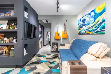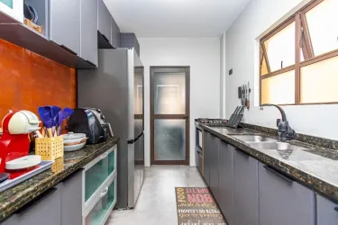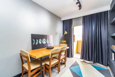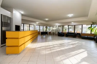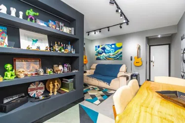 Sala de estar para 2 ambientes, com rack planejado, TV de 75 polegadas, mesa rústica em madeira maciça e sofá de alto padrão, sacada com churrasqueira, cozinha planejada completa, equipada com geladeira duplex, micro-ondas, cooktop, lava-louças e utensílios, área de serviço separada, com máquina lavar e seca, banheiro social e 1 vaga de garagem coberta, livre e numerada.