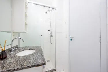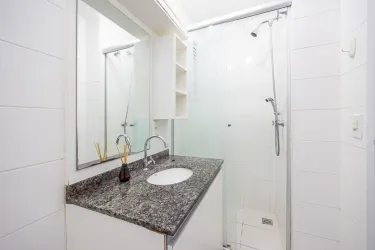 - Banheiro social e suíte com box vidro, espelho e armário;