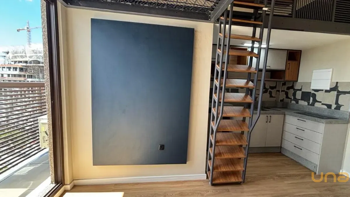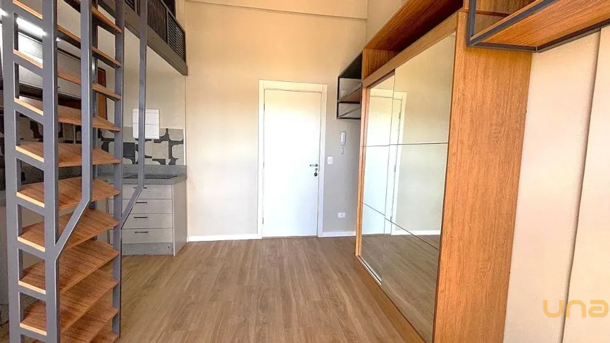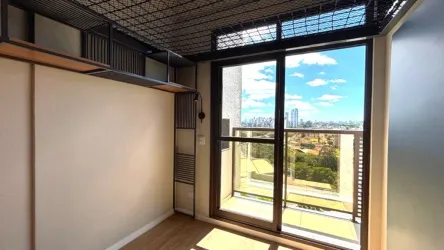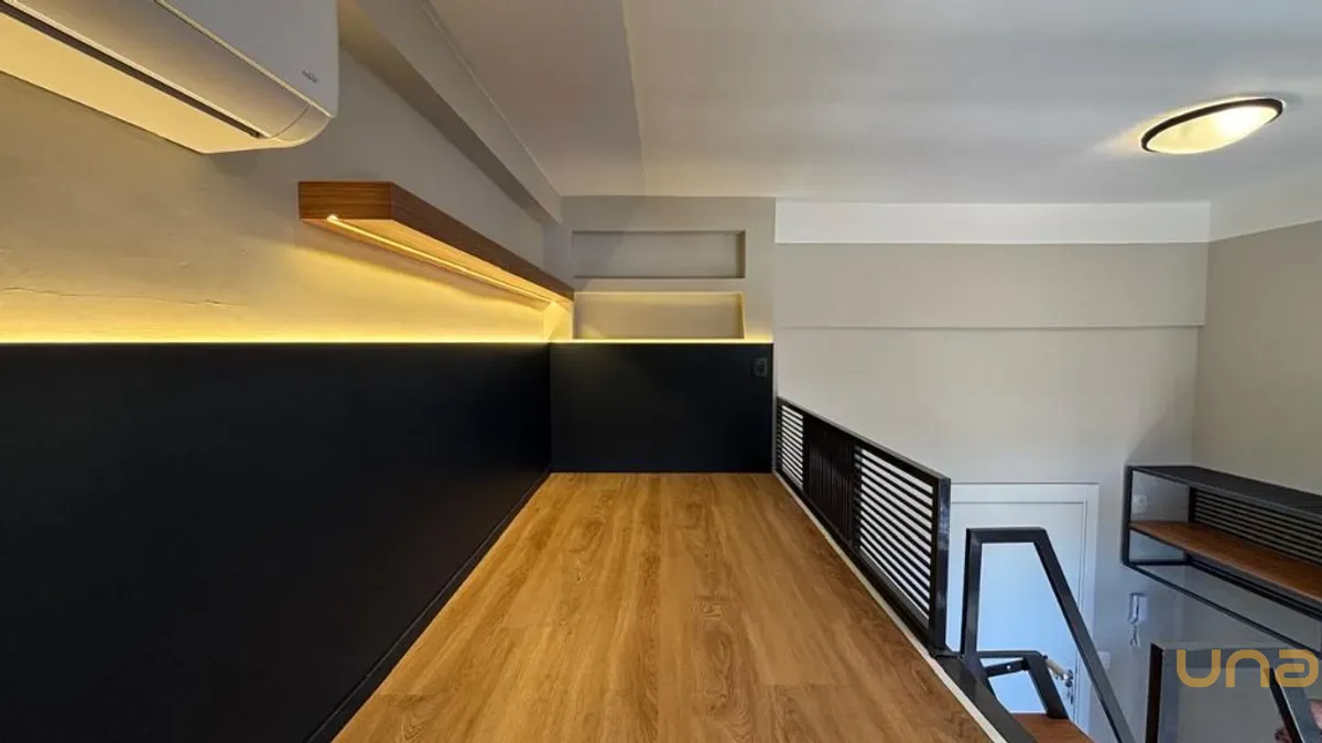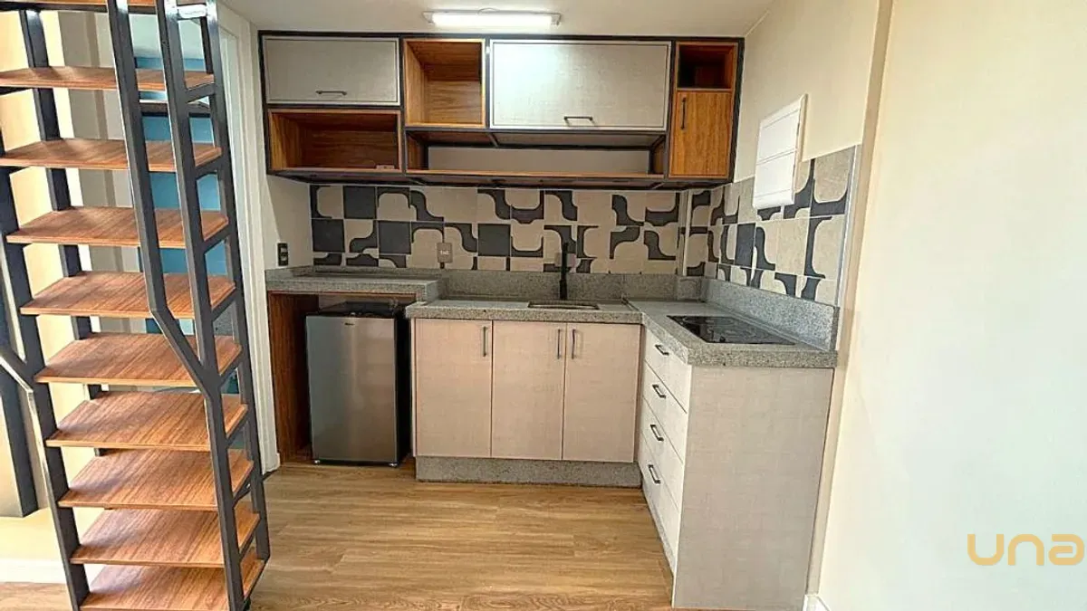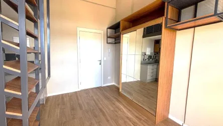 Studio com 21,57 metros de área útil, com sala para 2 ambientes, sacada com churrasqueira, banheiro, cozinha, acrescido de mezanino, aquele espaço à mais, para utilizar como storage ou um cantinho de leitura e de meditação.