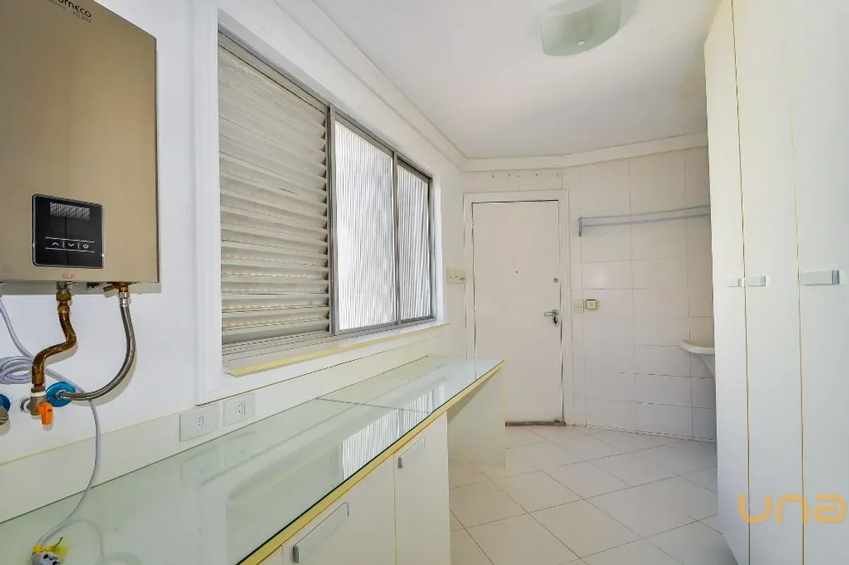 A cozinha é planejada e equipada com cooktop, forno elétrico e máquina de lavar louças, integrada à área de serviço com armários. O apartamento dispõe ainda de sacada, cristaleira e armários com compartimentos secretos, agregando sofisticação e praticidade.