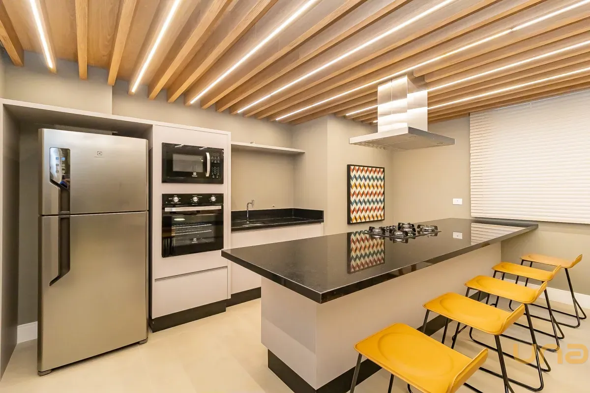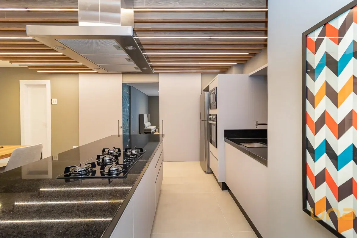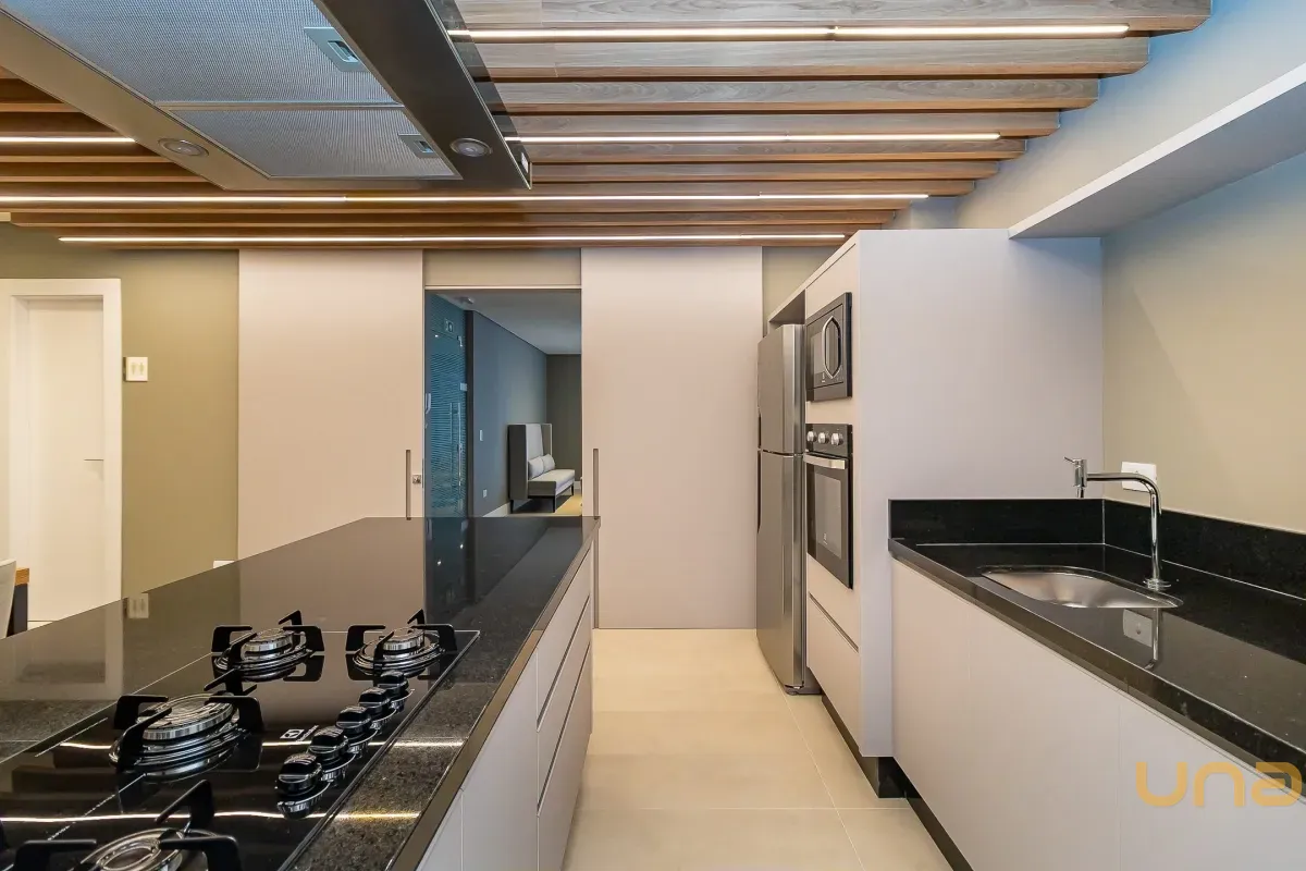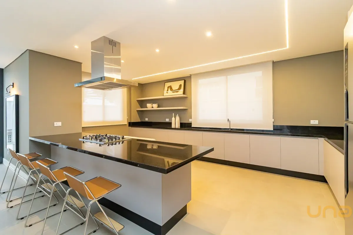 - Cozinha com armários planejados, Coifa na ilha com fogão de indução, Forno elétrico, Geladeira, Micro ondas com função grill; torneira gourmet monocomando e Lixeira embutida;