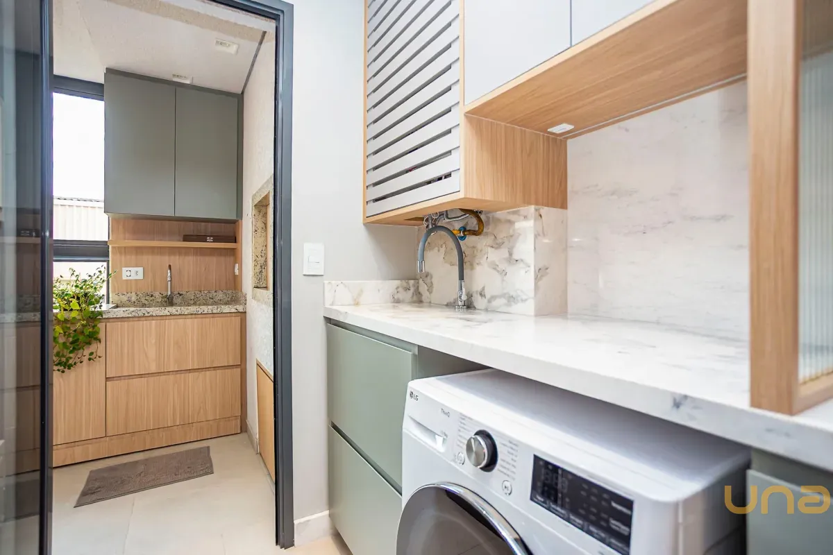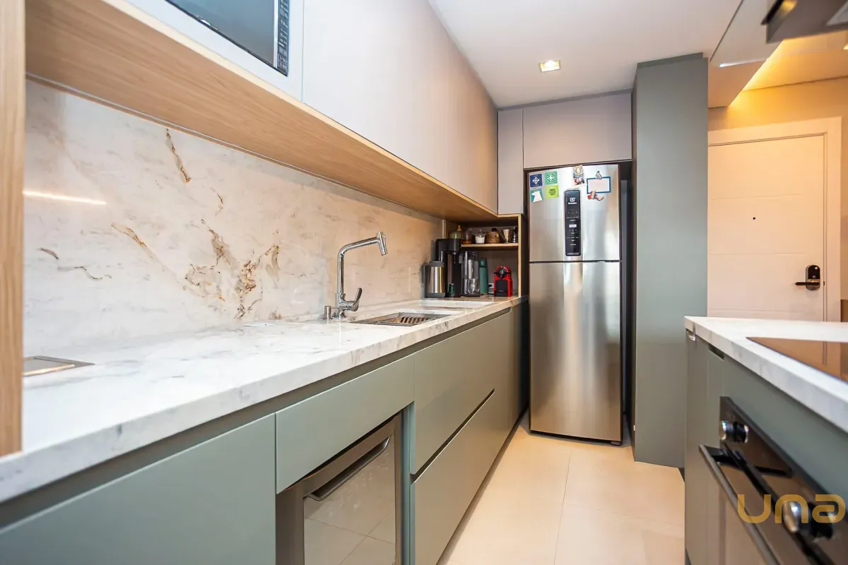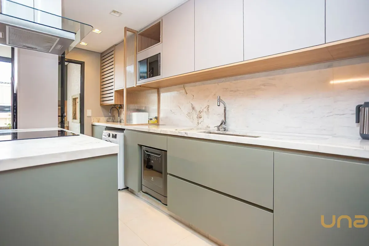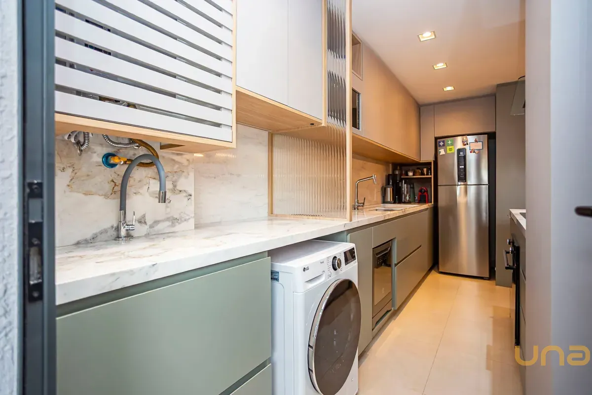 - Cozinha com armários planejados, Coifa na ilha com fogão de indução, Forno elétrico, Geladeira, Micro ondas com função grill; torneira gourmet monocomando e Lixeira embutida;