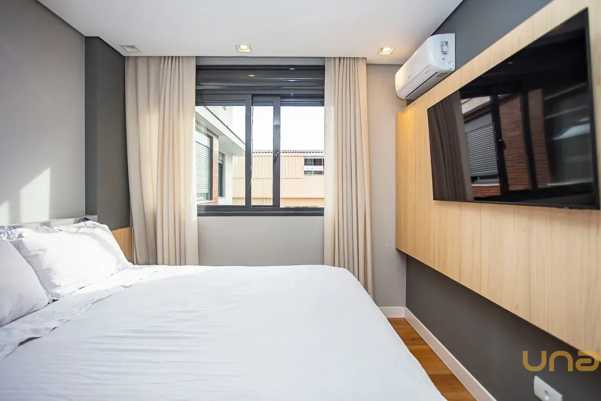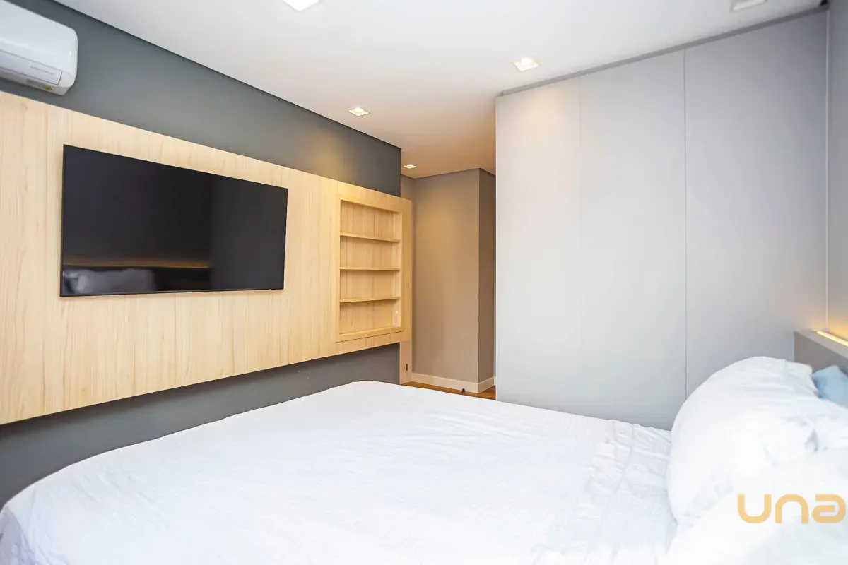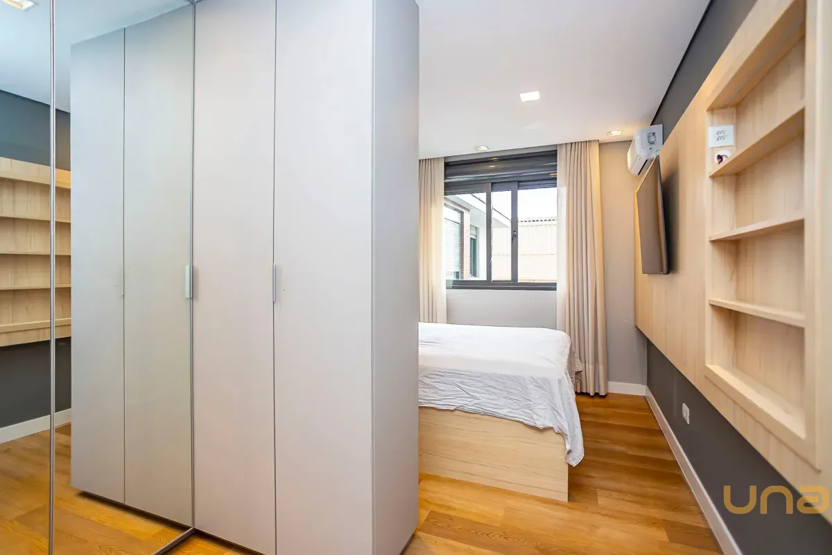 - 02 dormitórios sendo 01 suíte com close, cama de casal, painel para televisão planejado e cortinas sob medida;