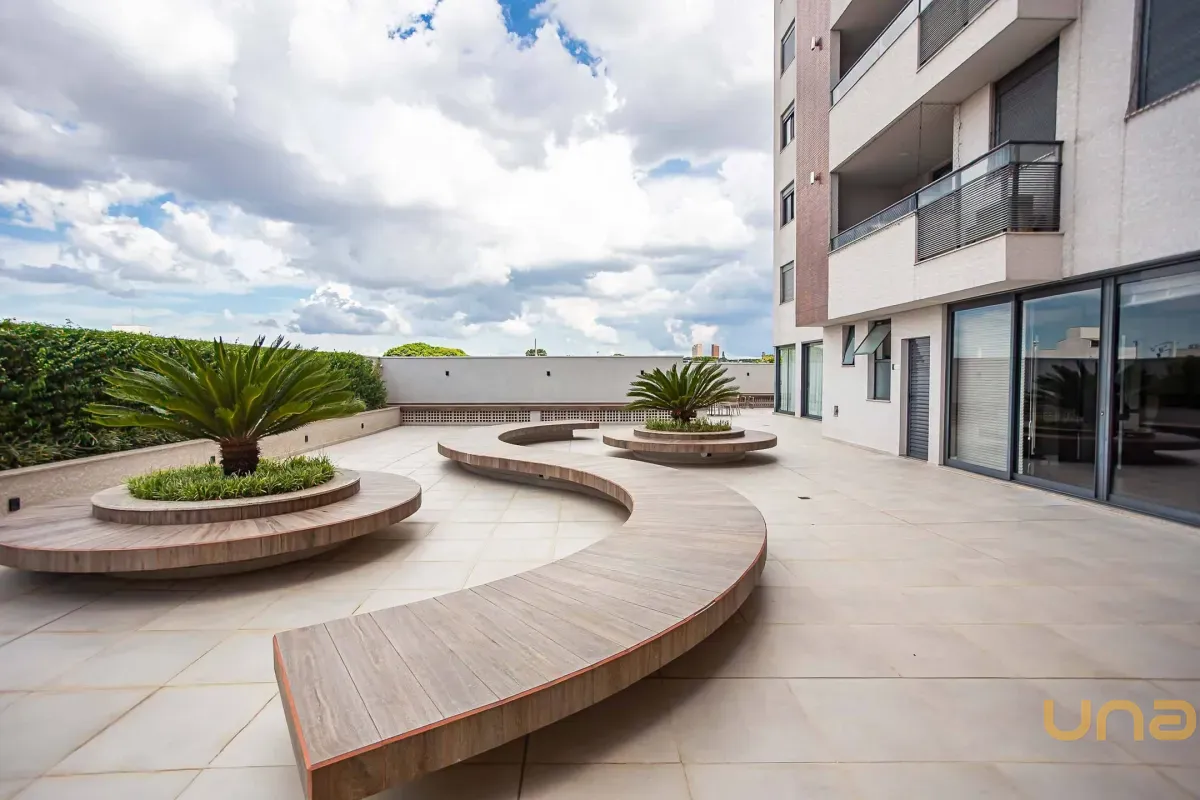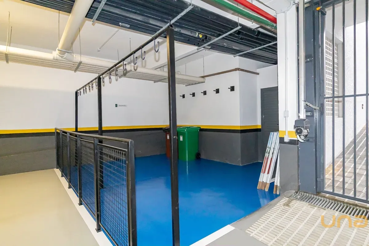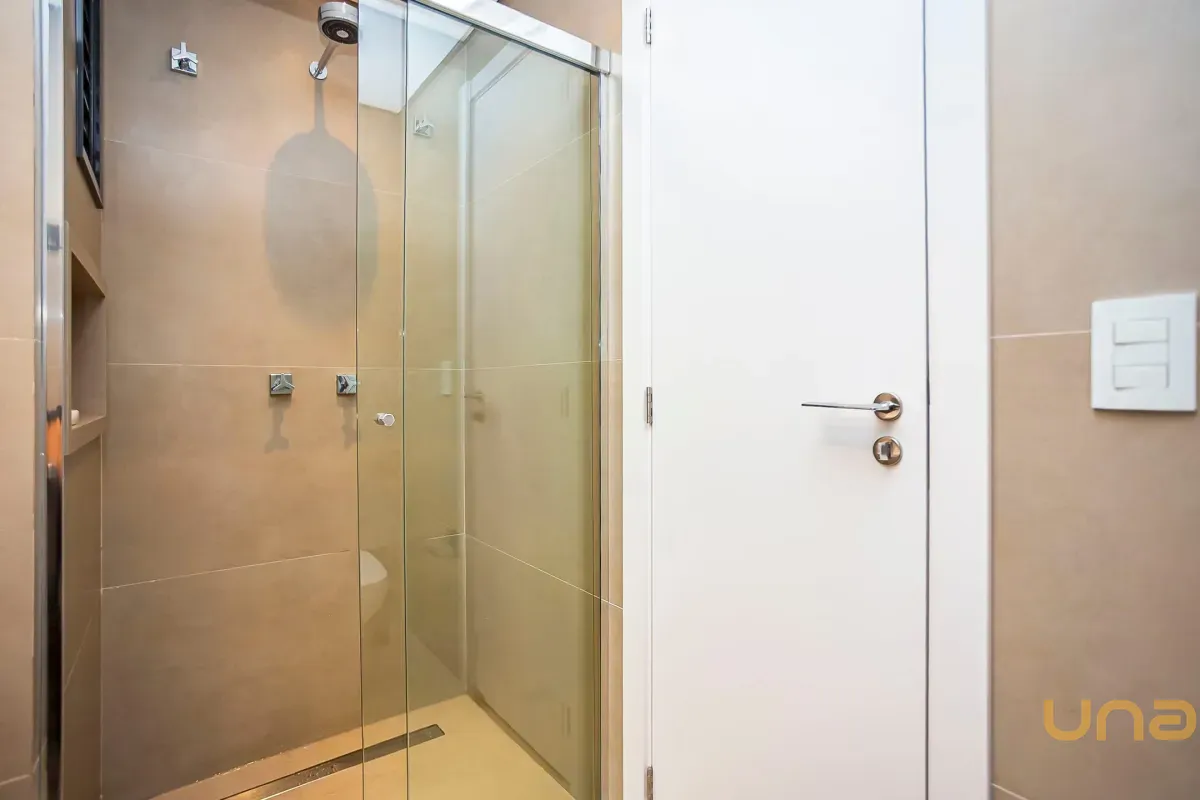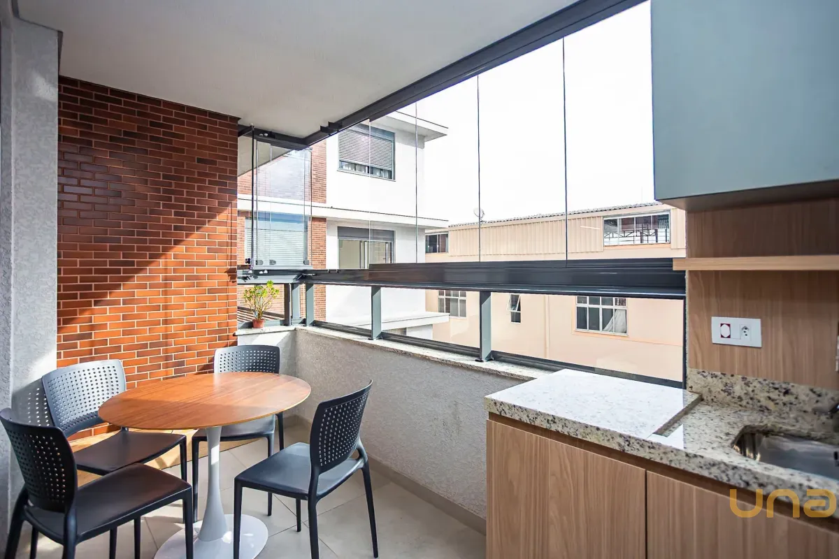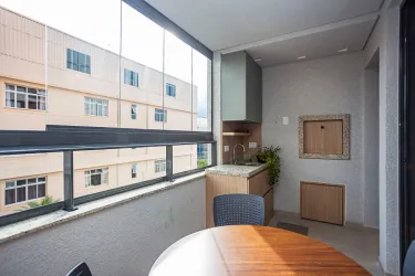 - Churrasqueira a carvão, pia e armários planejados na sacada com fechamento com cortina de vidro.