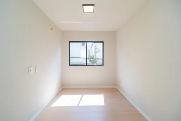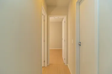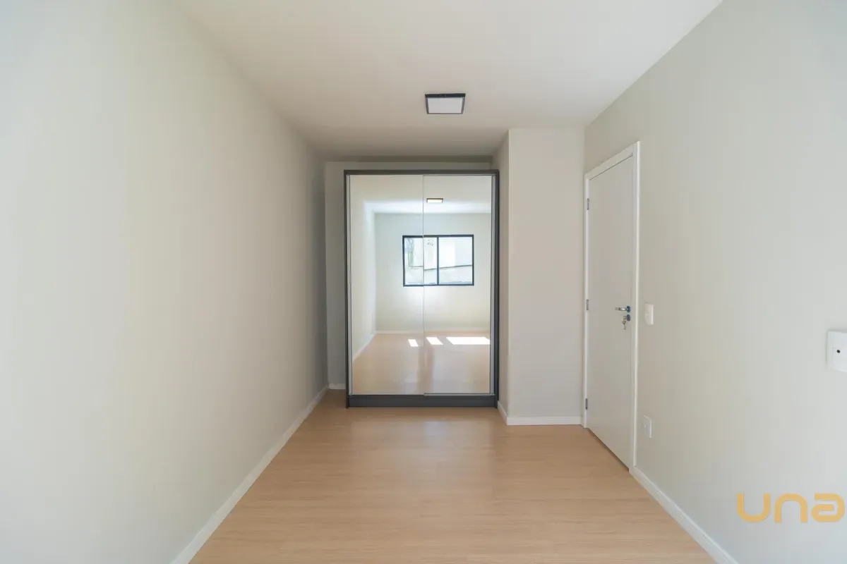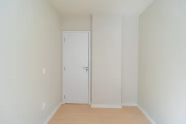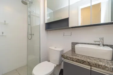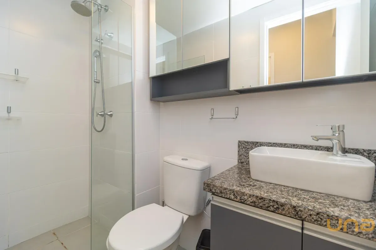 Possui banheiro com armário, espelho e box em vidro, além de 2 quartos, sendo um com armário.