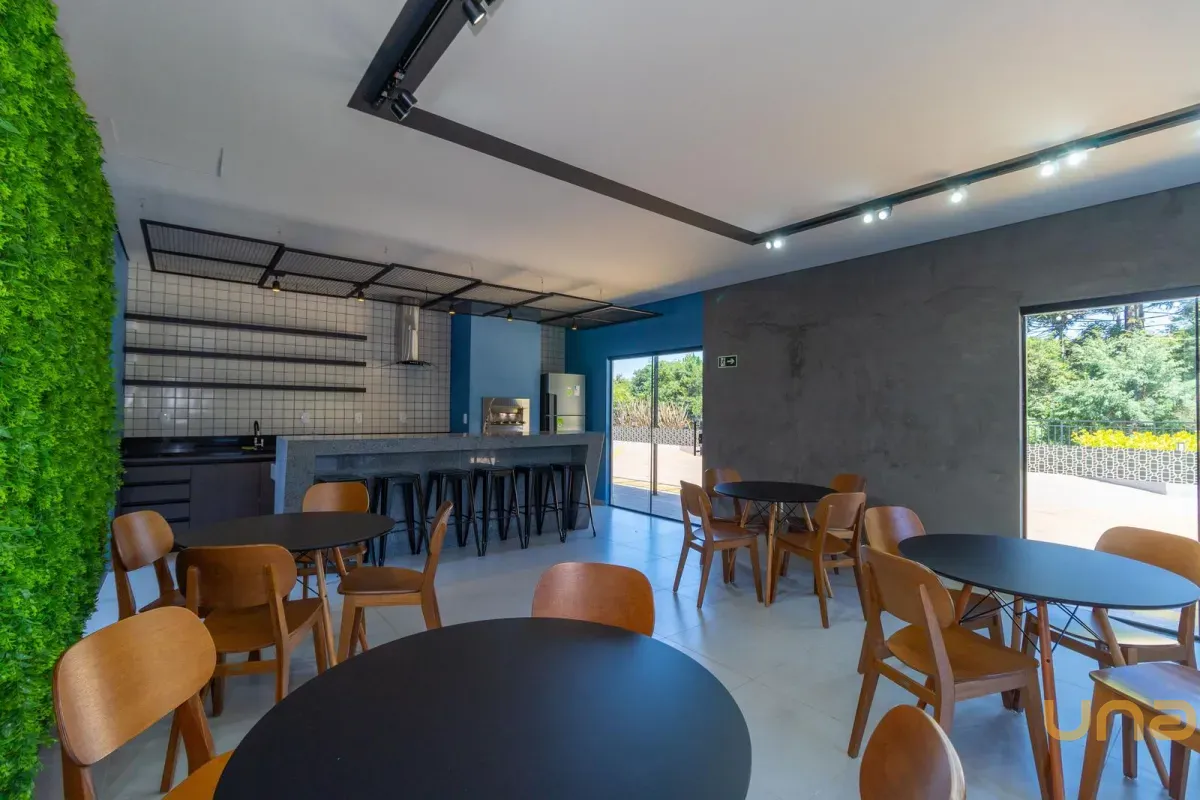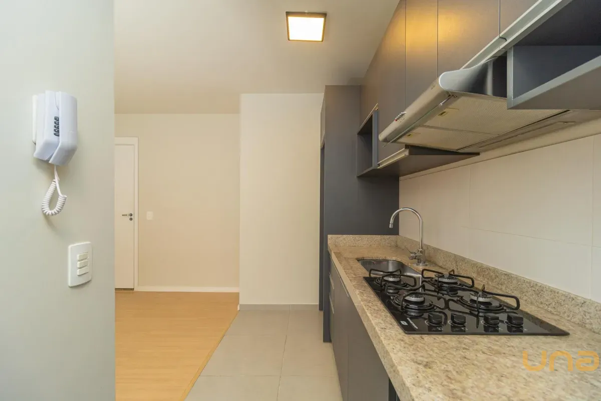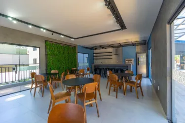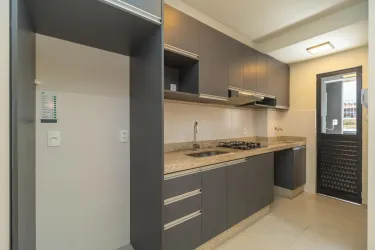 A cozinha em conceito aberto dispõe de móveis planejados, cooktop e depurador, garantindo praticidade no dia a dia. A lavanderia é integrada e conta com tanque embutido e espaço para máquina de lavar.