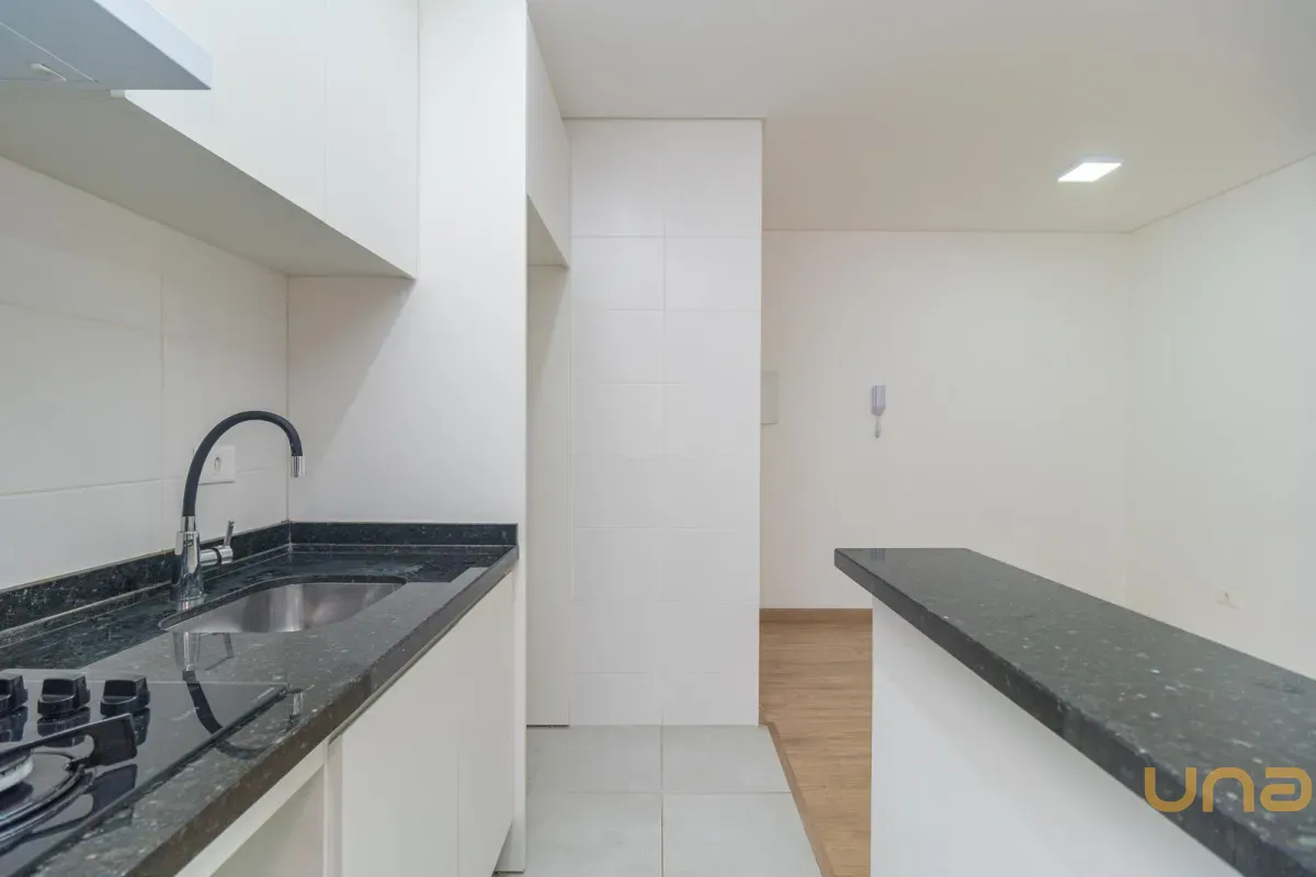 A cozinha é em conceito aberto, equipada com armários planejados, cooktop, depurador e bancada, proporcionando funcionalidade e organização.