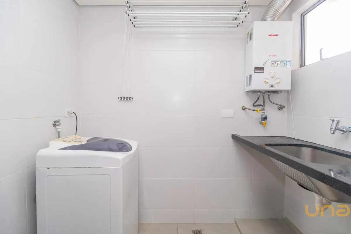 A cozinha é completa, com armários planejados, geladeira, purificador de água, ilha com cooktop, forno elétrico, micro-ondas, depurador de ar e bancada em granito para refeições rápidas. A lavanderia é anexa, equipada com armários, tanque embutido e máquina de lavar.